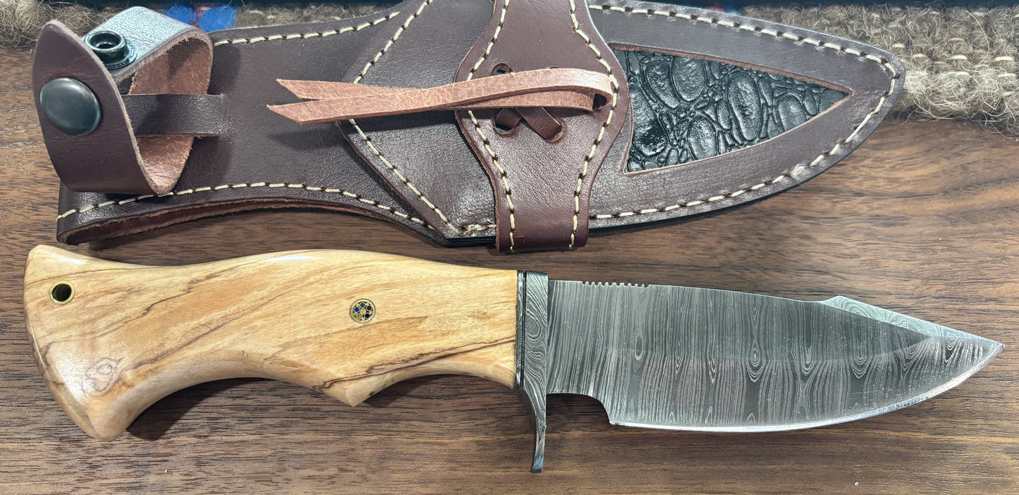 A nice overall blade.  Choice of Delrin (black -rigid synthetic) or olive wood (light) handle.  Full tang; True Damascus folded and forged steel.  Be careful with these blades, they cut quickly and deep.  Knife is about 9.5" overall.   Hefty in design with a good solid feel to the handle, there are years and years of use in these puppies with just a bit of care.