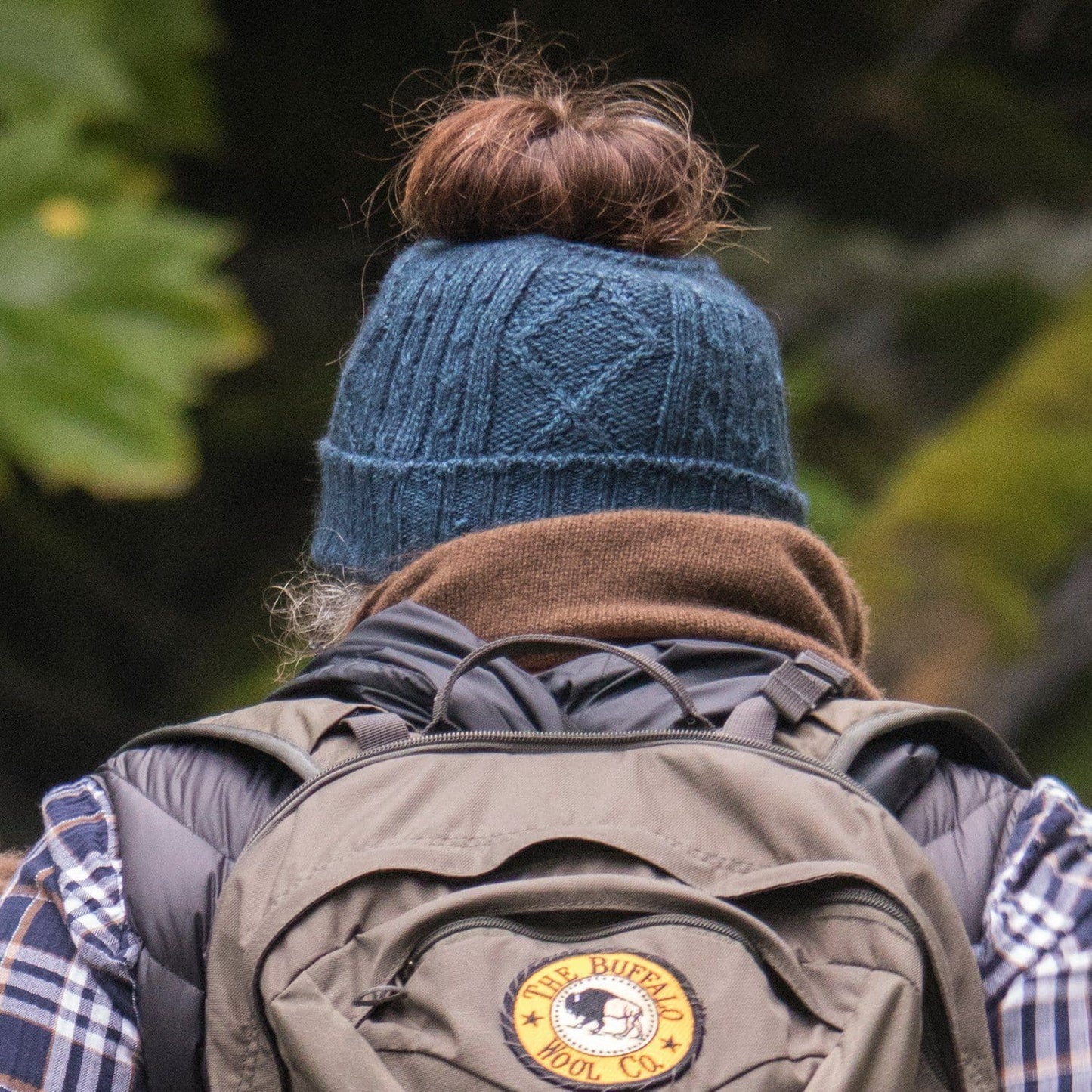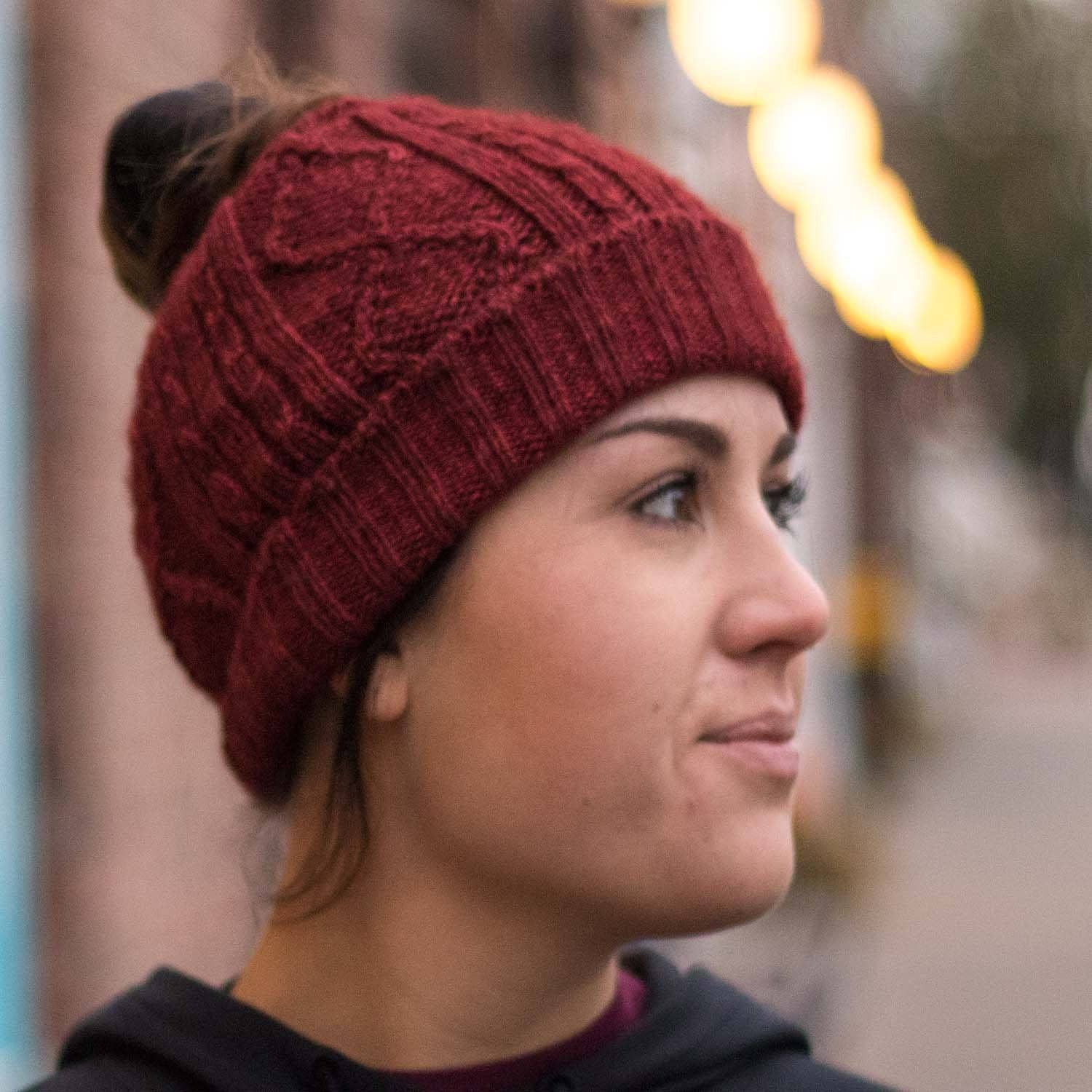 - Diamond & cabled knitted design pattern on the hat, top open for bun