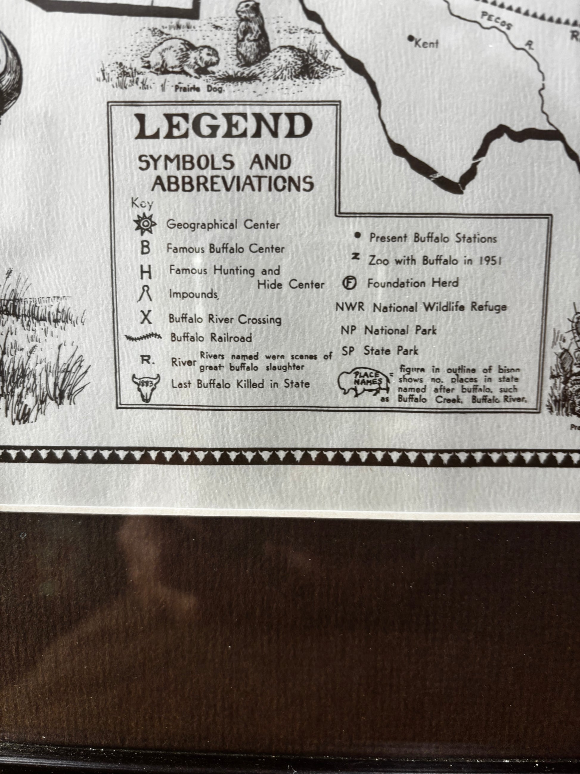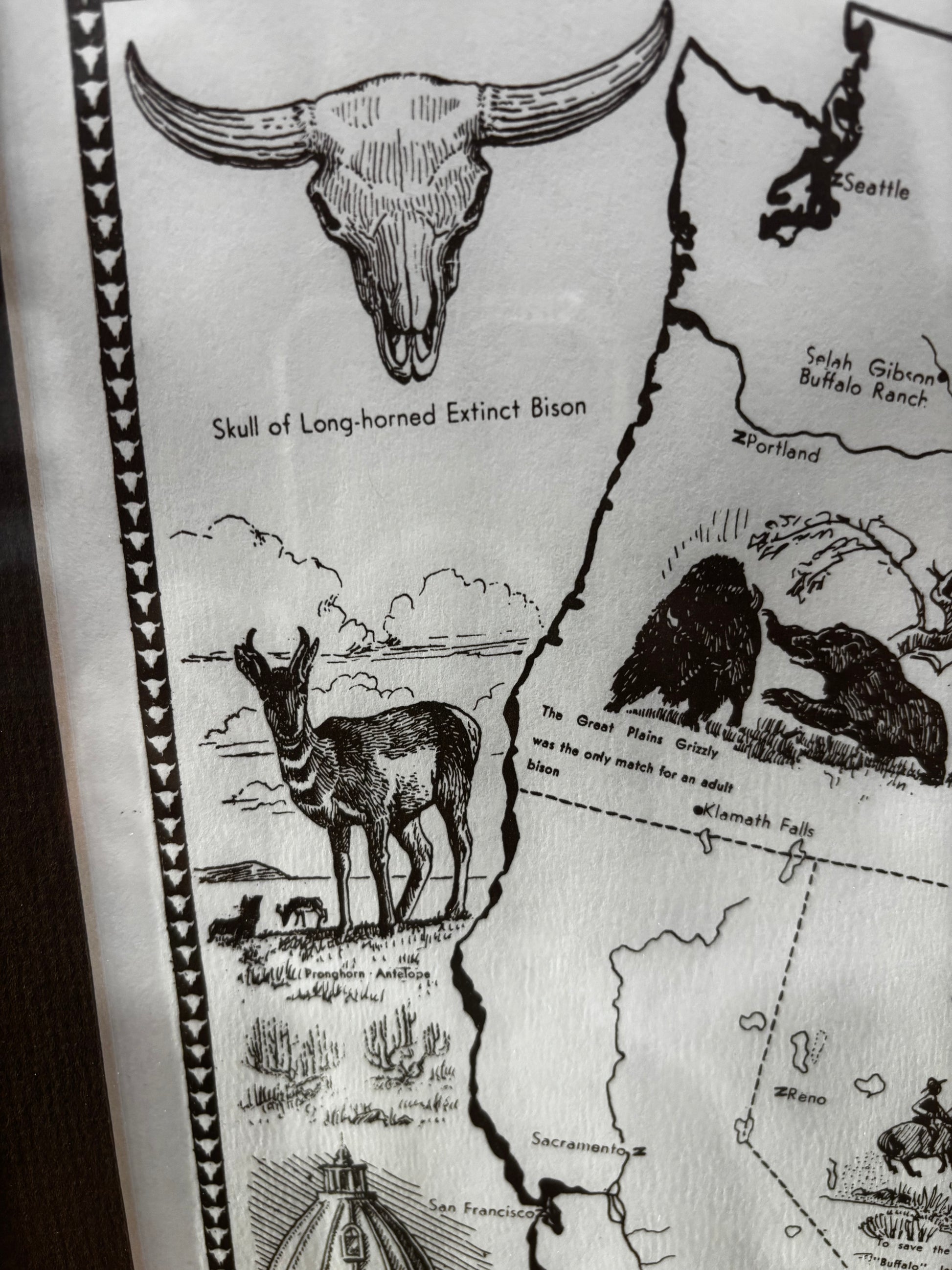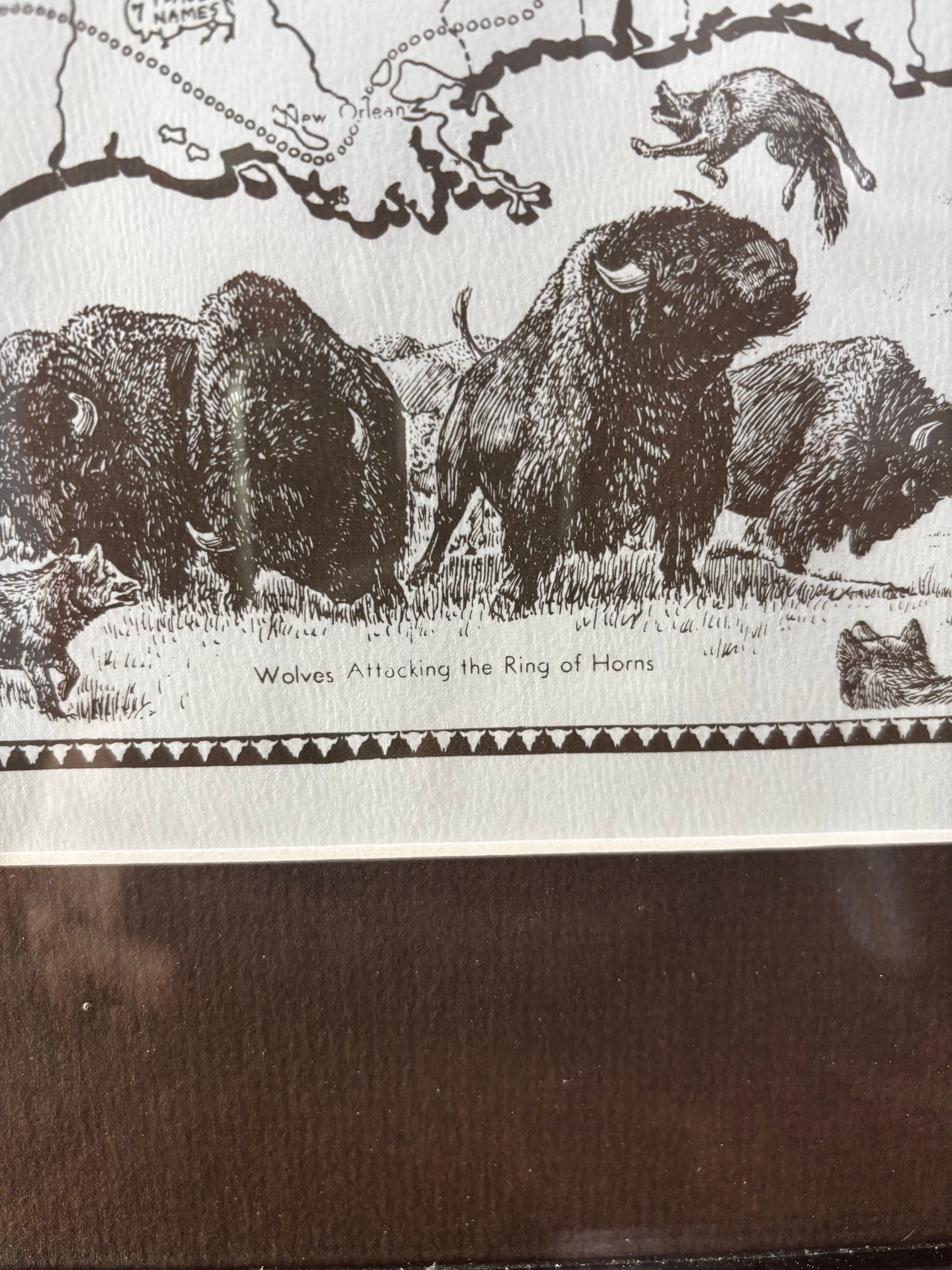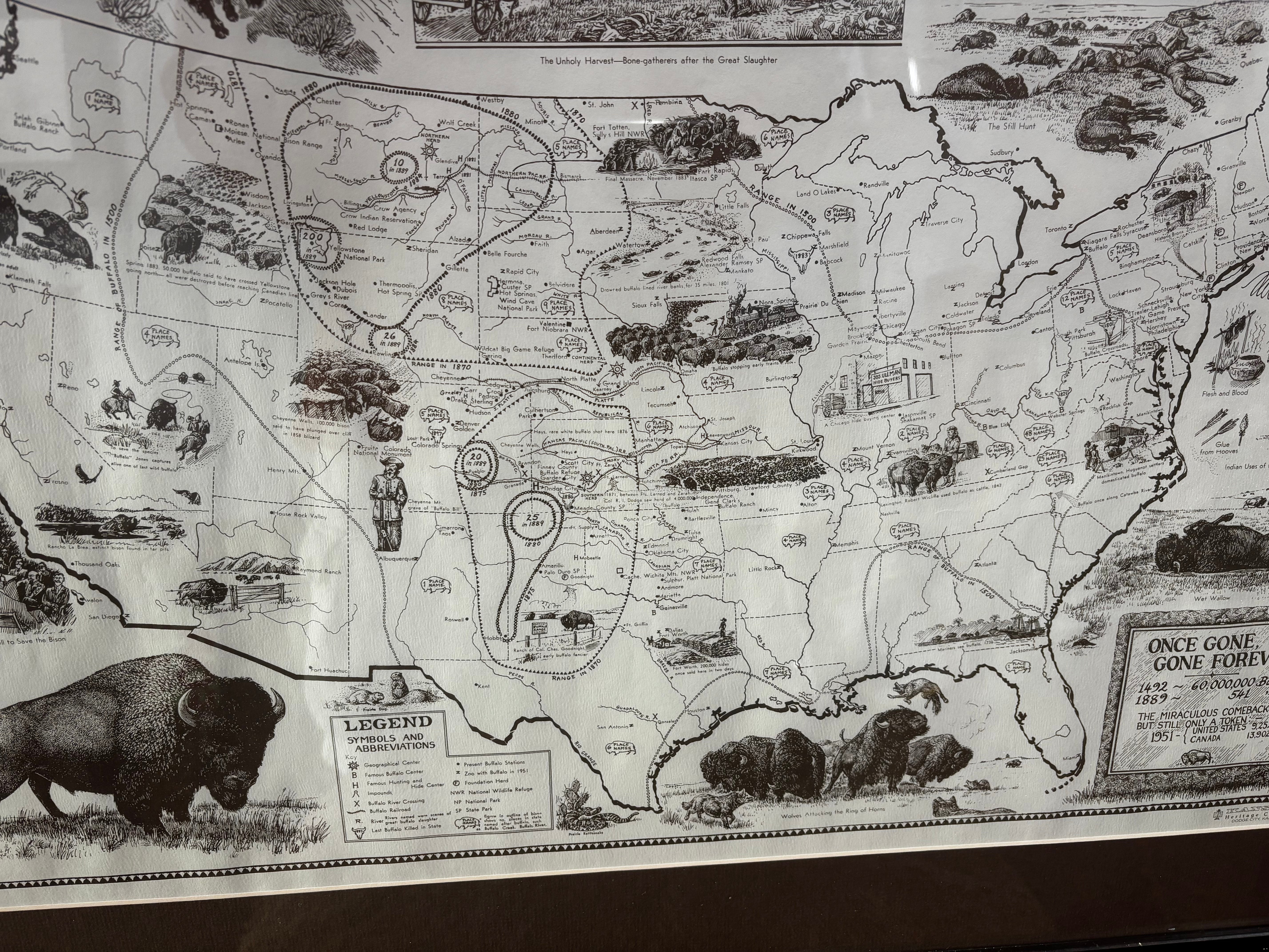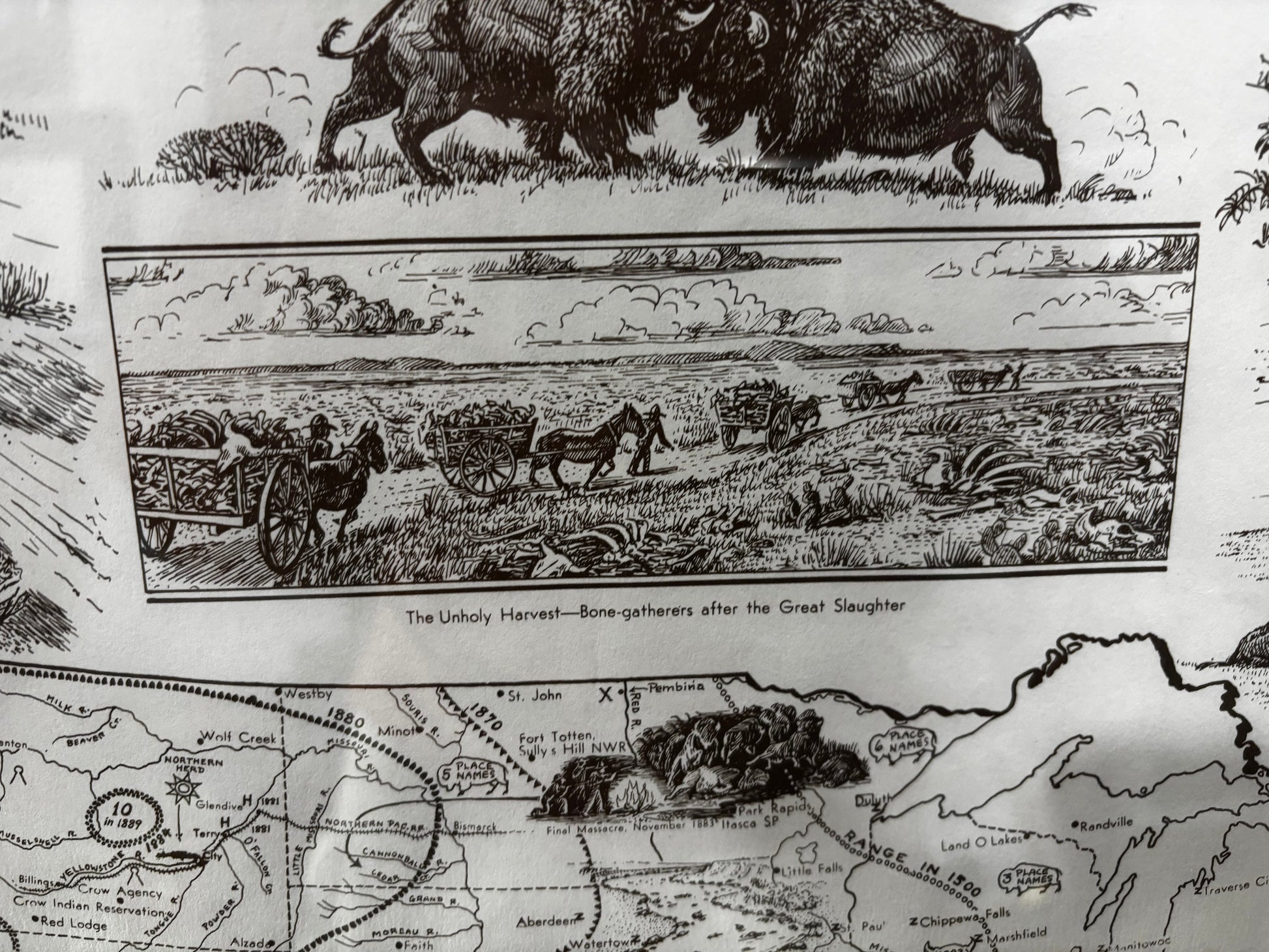Only one I have ever seen or found .... thought undoubtedly there were others at one time. It starts with the map William T. Hornaday drew for the Smithsonian back around 1897 - Hornaday's then personally counted bison census; backs up into estimated historical bison range. They the artist here adds some wonderful vignettes ... more than 25 of them ... on historic bison "things" - the great slaughter, the native prospective, buffalo wallows and so much more. Then, the artist points out "bison" or buffalo names and places in each state. Then .... your eyes just keep finding new pieces of this great documentation of history.
