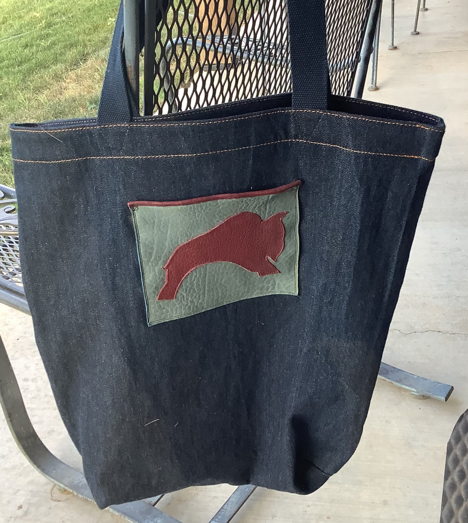 Levi Denim Tote done for use with bison leather bison emblem and bison leather hand-holds on the strap. All hand cut and sewn by a real artist with the sewing machine and scissors.