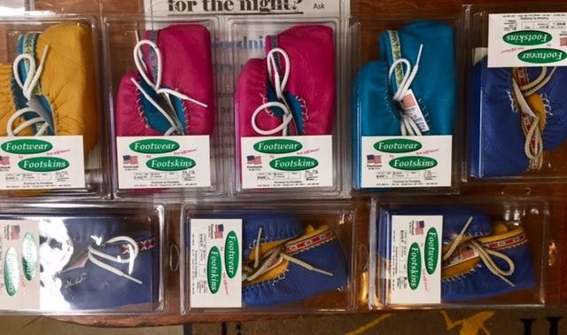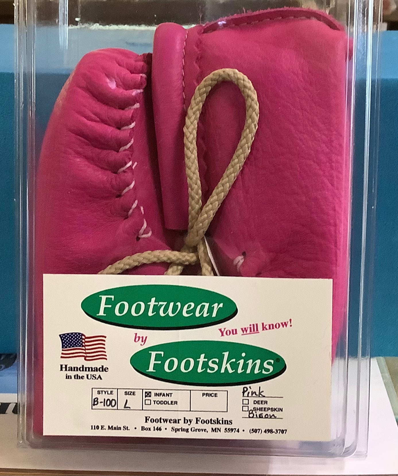 Please Note: Infant moc's have the trim ribbon around the ankle; Toddler mocs do not. Also note that the colors shown in the picture by the size is just representative and not necessarily the only color available. We give FOOTSKINS free leeway to use any color or color combination so we are always pleasantly surprised when our orders arrive.