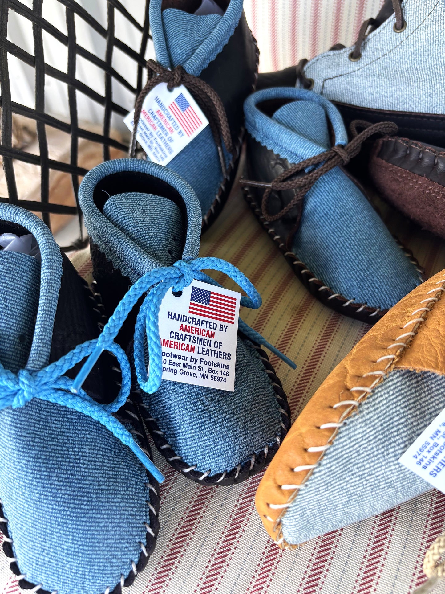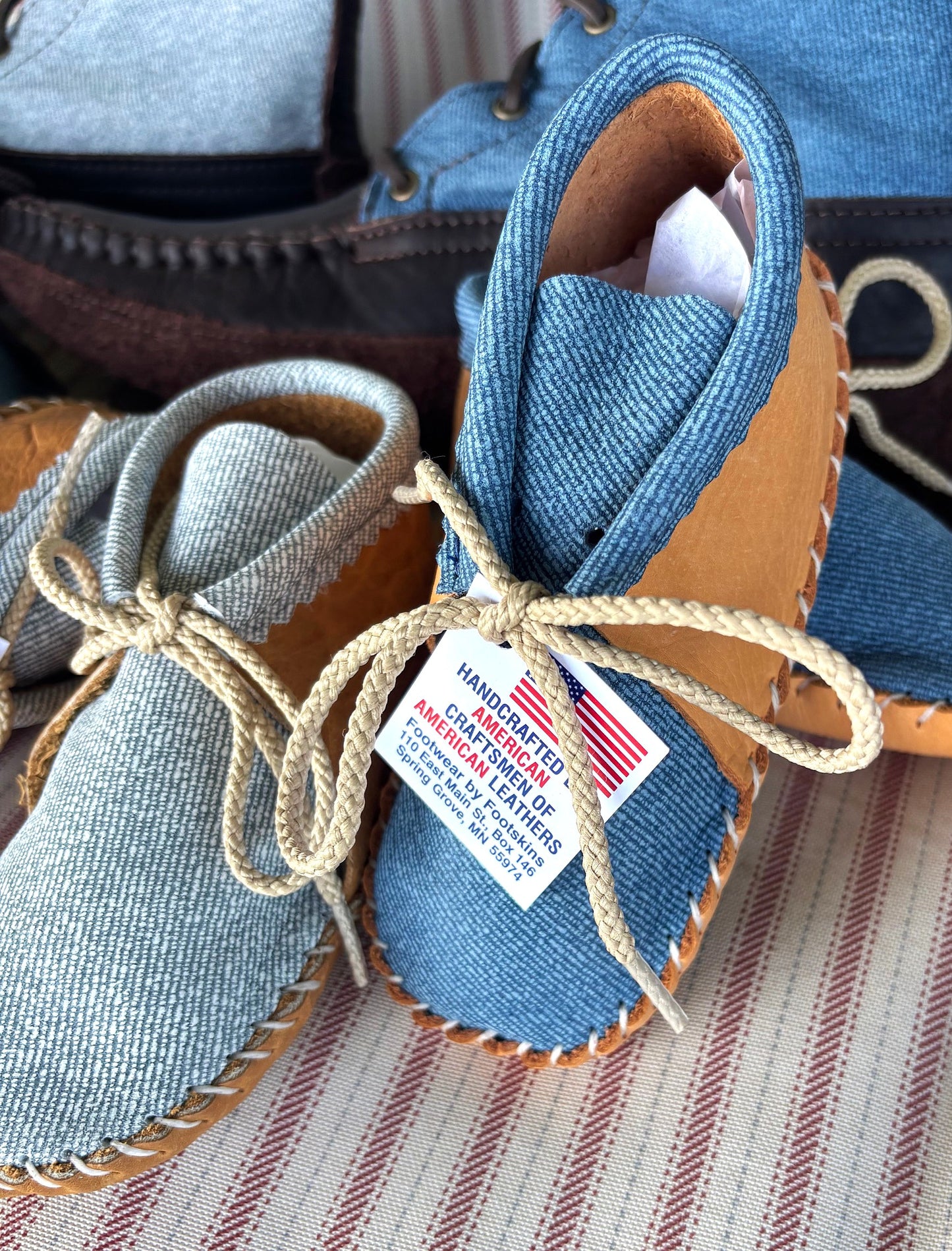July 16, 2025: Toddlers with denim leather trim - Medium and Large. (other sizes available on special order)
