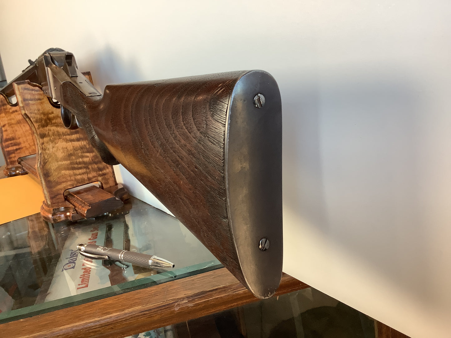 The overall condition is good. Strong action. The bore is bright and rifled. A thin split is present on the pistol grip and remains stable with light pressure. Solid buttstock. The frame has smooth brown patina, and the barrel finish has been scoured.