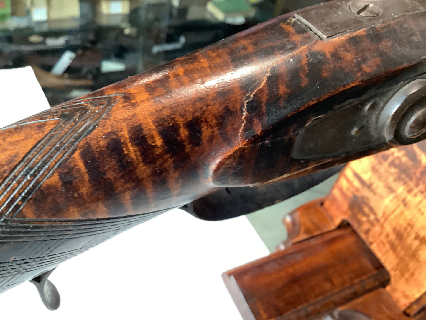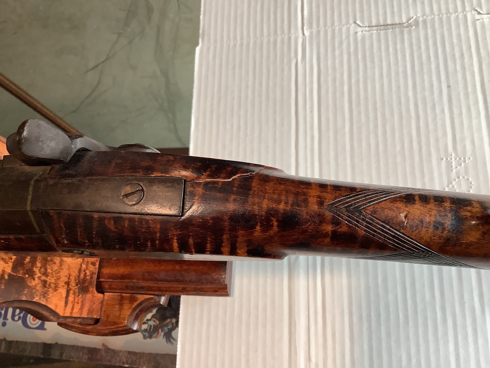 Checkered wood half-stock. Finish worn trigger guard, double set triggers, lock plate, hammer and barrel. Engraved patch-box on the right side of the stock. Front and rear fixed sights. Cap and Ball Black Powder muzzle loader. Antique ,No FFL required and ships to most buyers homes.