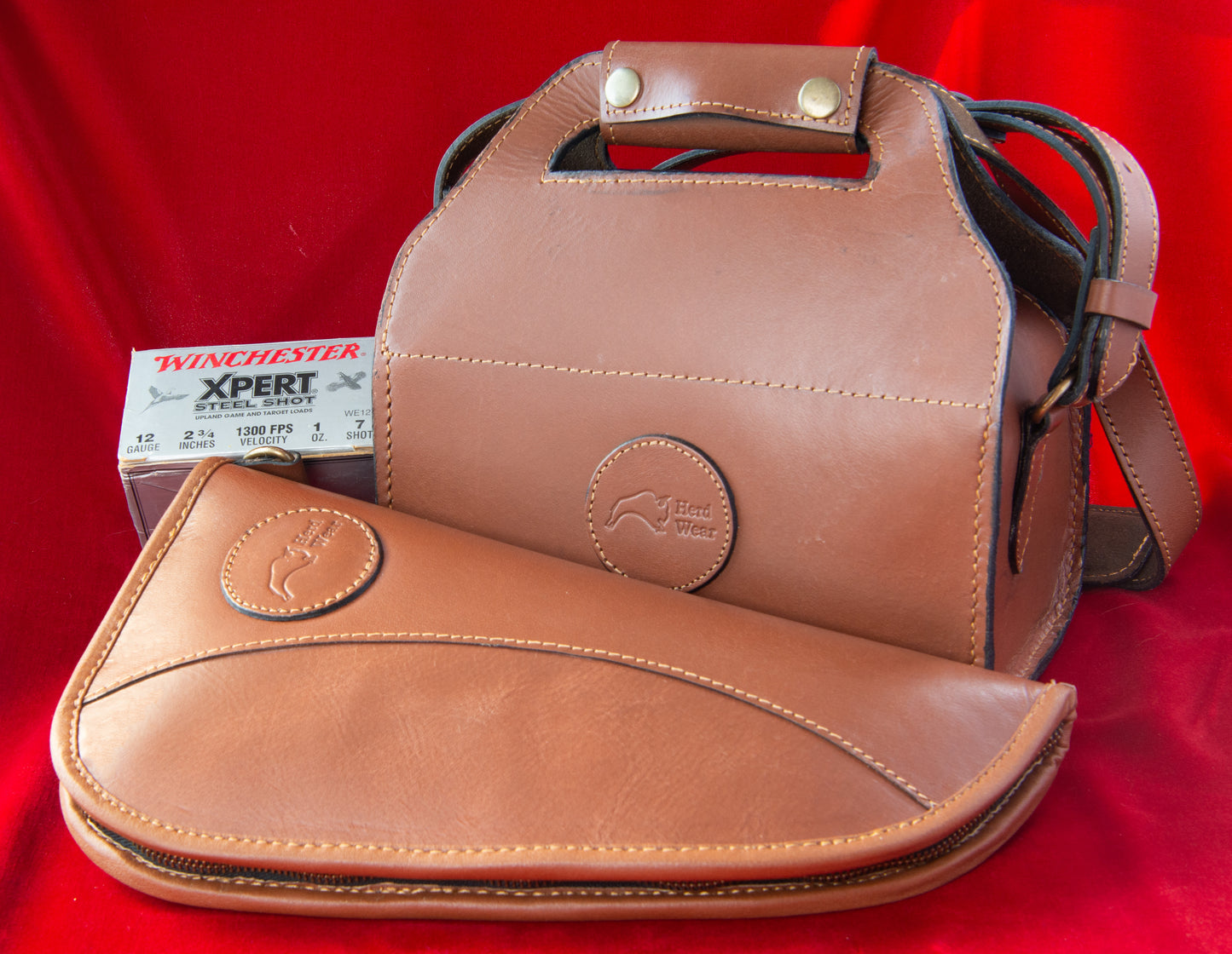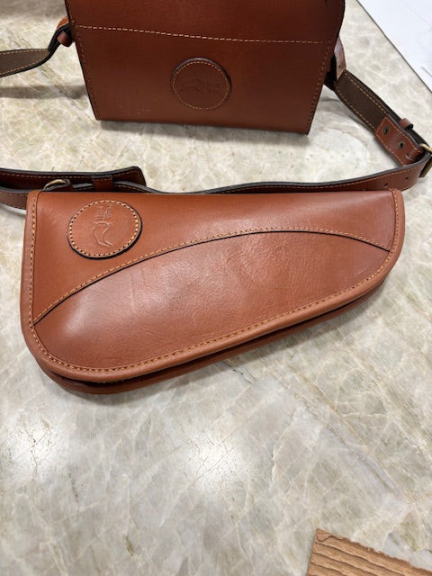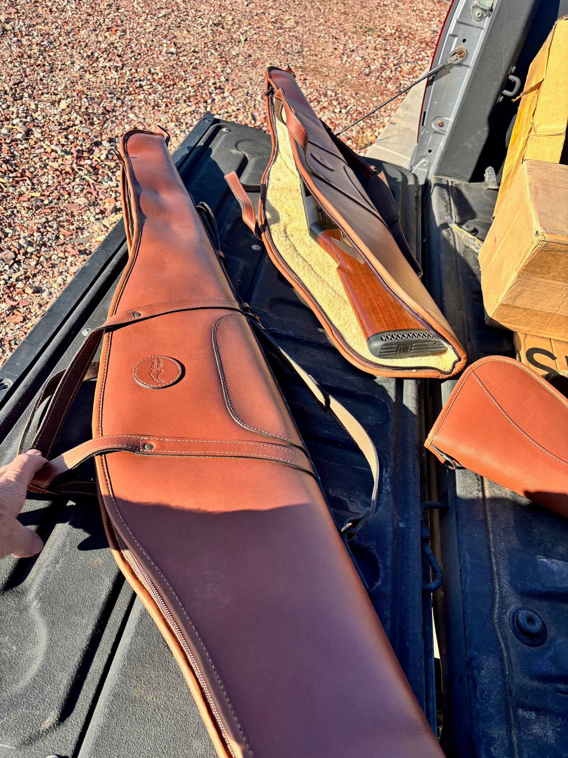 Custom Harness Leather shotgun and pistol cases plus shotgun shell carrier