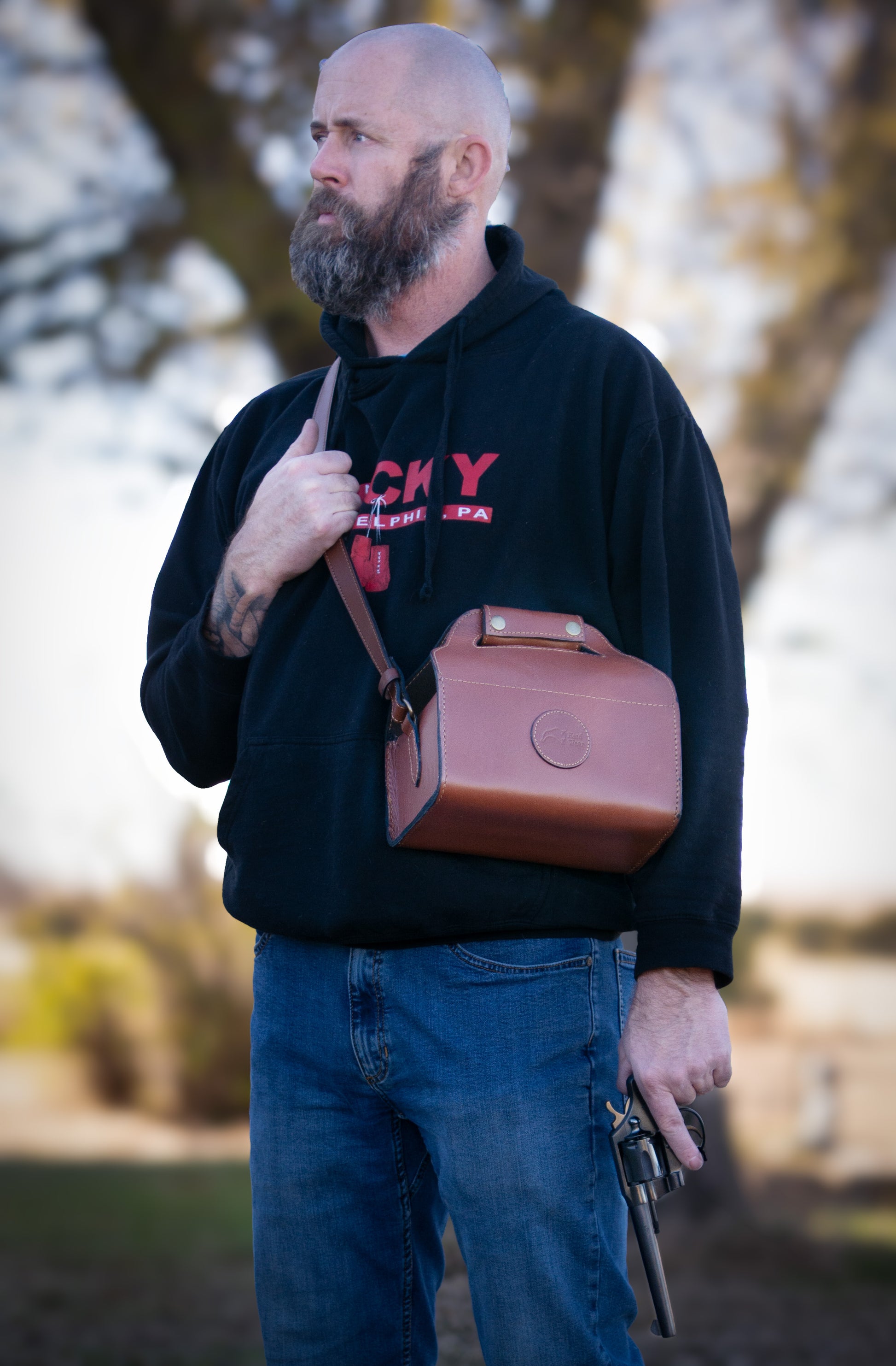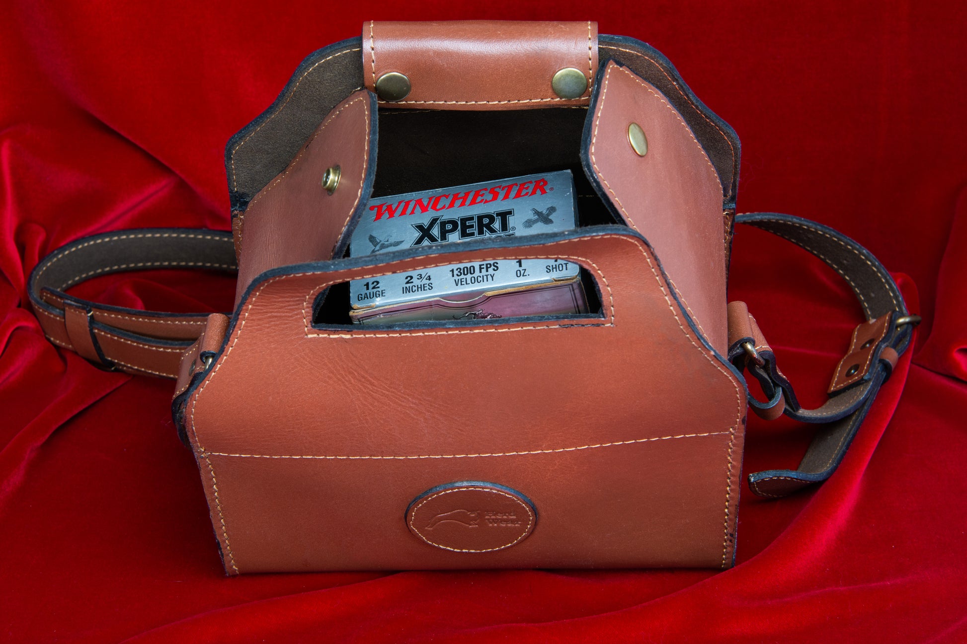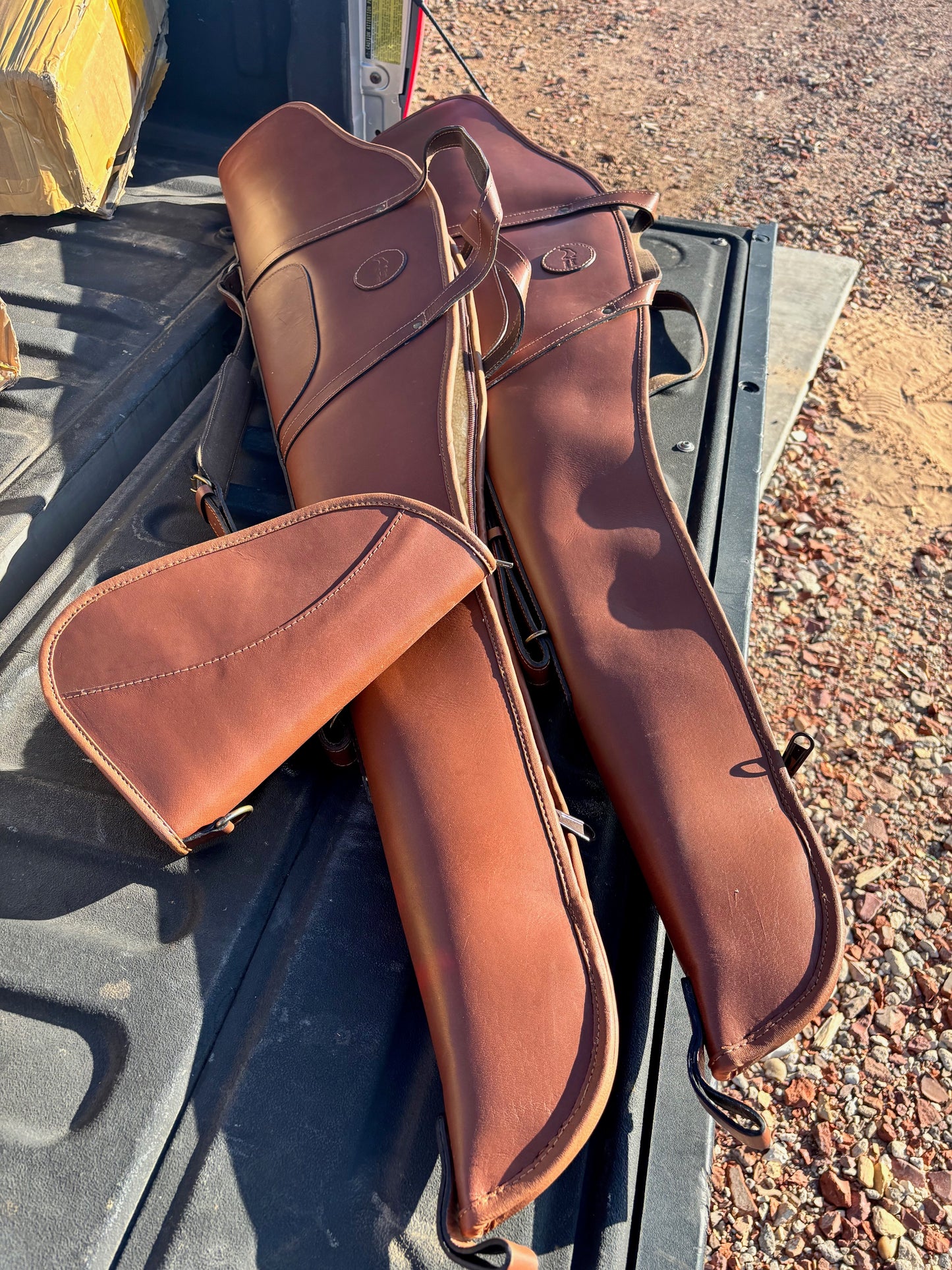 Custom Harness Leather shotgun and pistol cases plus shotgun shell carrier
