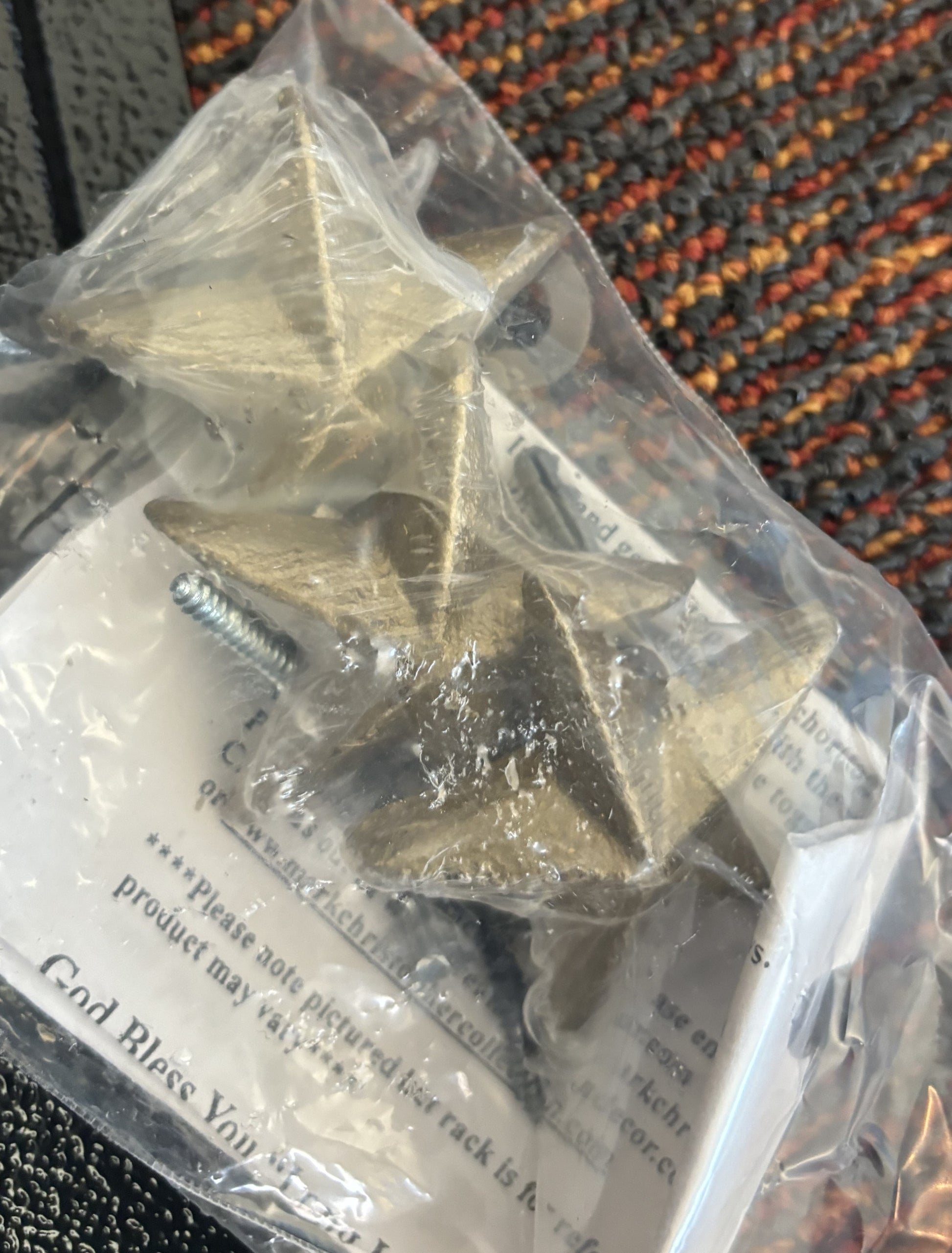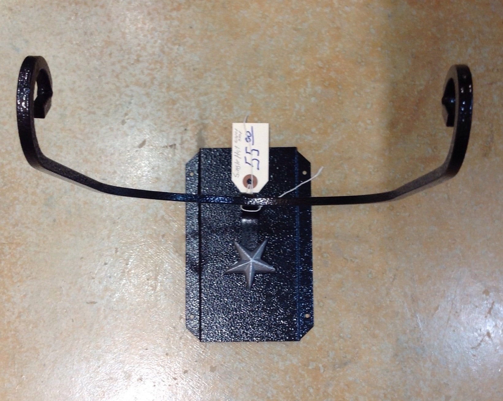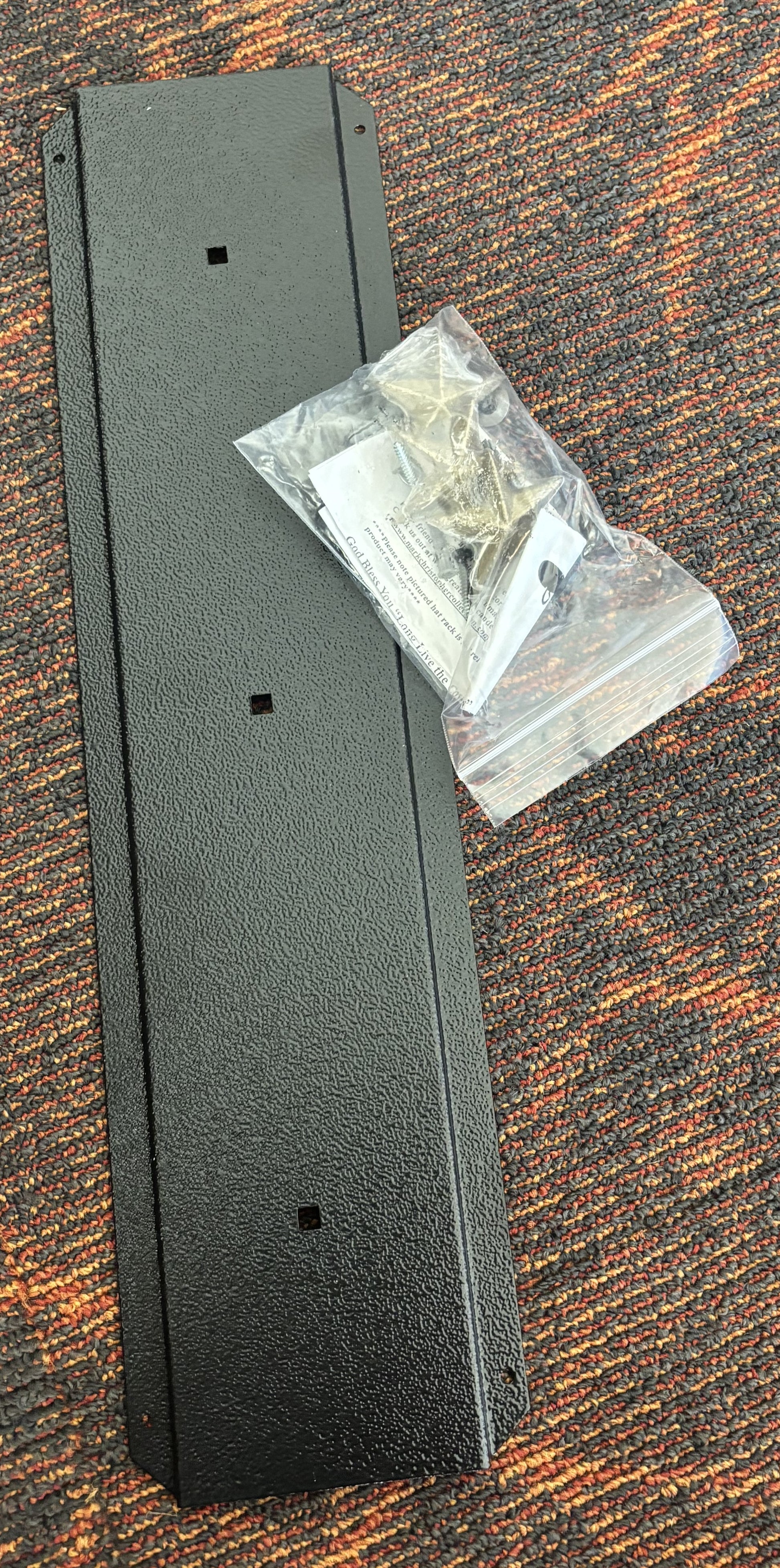 Three hat (picture is just a single ... but the one available is for three hat - see unassembled picture of back piece and silver stars) Hat Rack. Black hammered look metal back and arms; 3 hat holders and 3 silver stars. Comes unassembled (but it is only a couple twists to put it together again). Clean, nice and dang handy! Keeps the crown up off the table (or bar) and out of harms way. Last one.