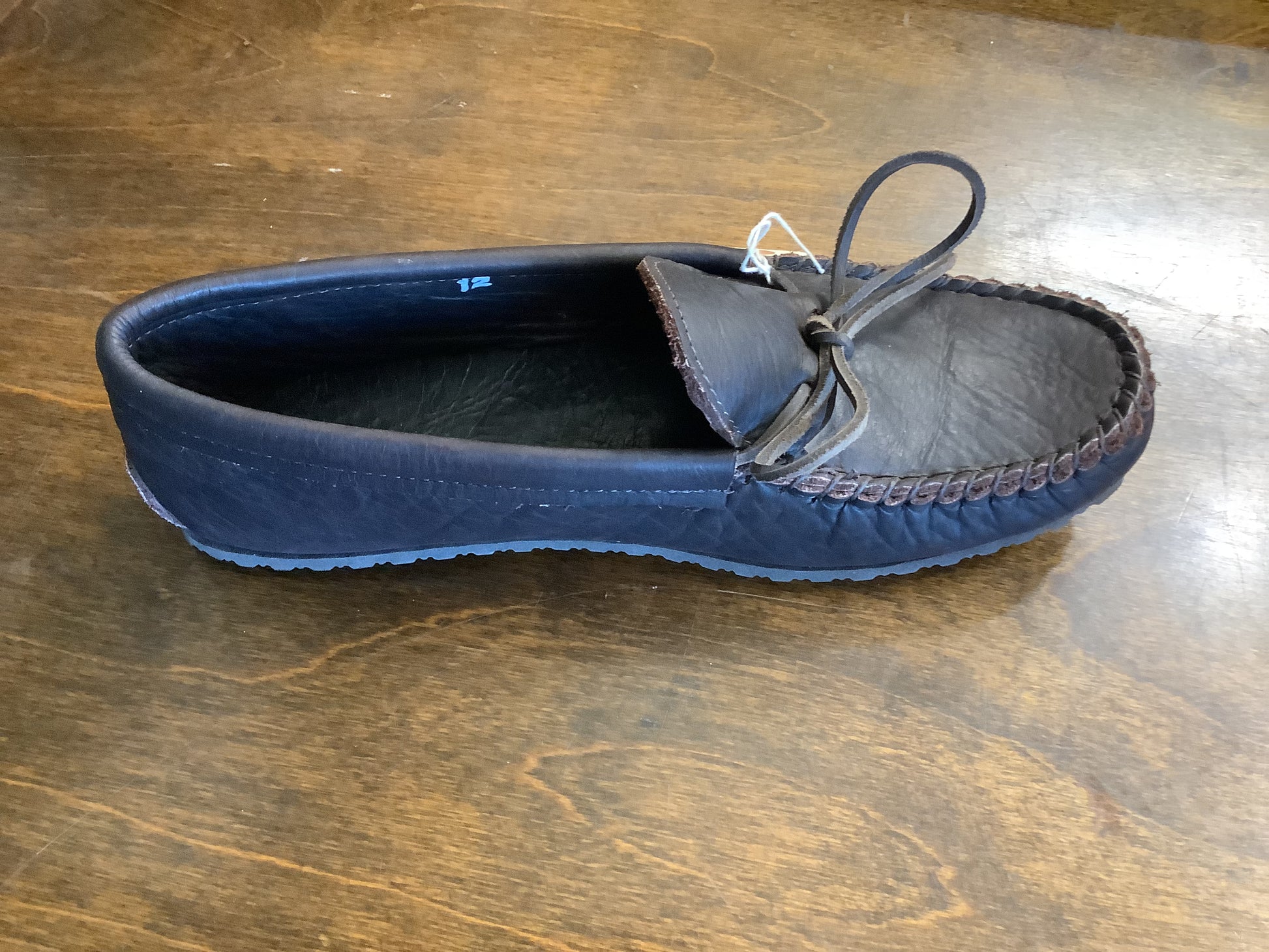 Available in black or dark brown shrunken/pressed grain bison leather. Exceptional leather! Great slip-on moc!