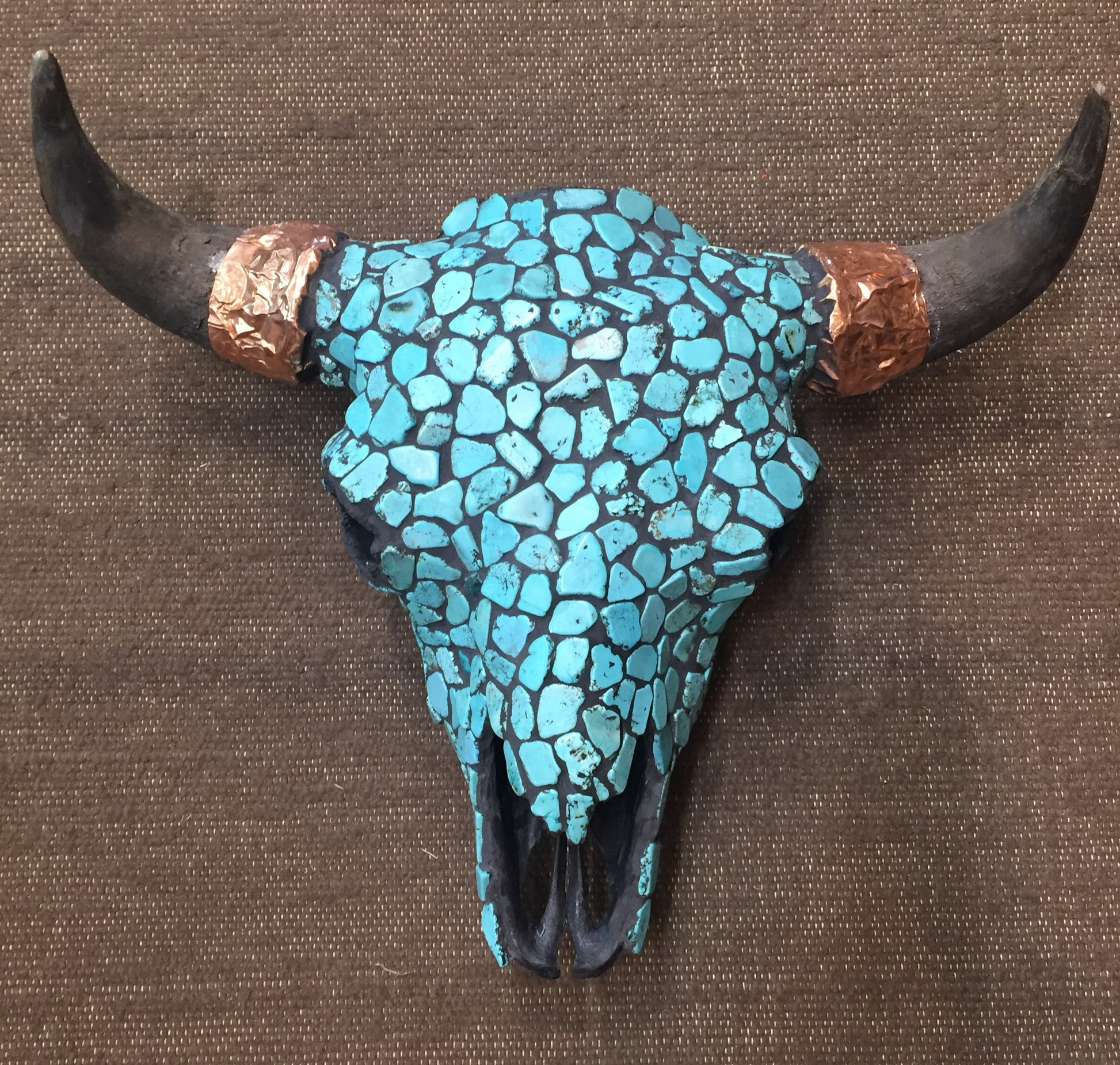 Artists Jackie and Mark Hanson, right here in Goodnight Texas, worked on these two huge bull skulls for a month. The process is hands on and intensive to create, first working the skull to accept the stone and then laying and filling. (White is sold; turquoise is available).