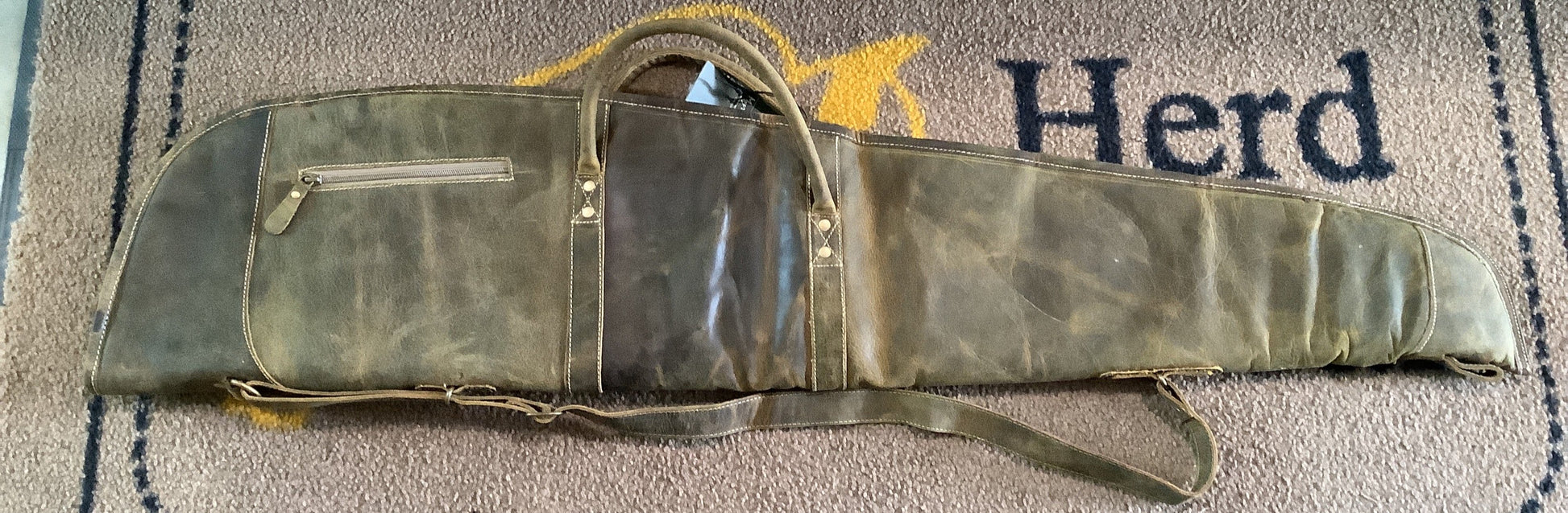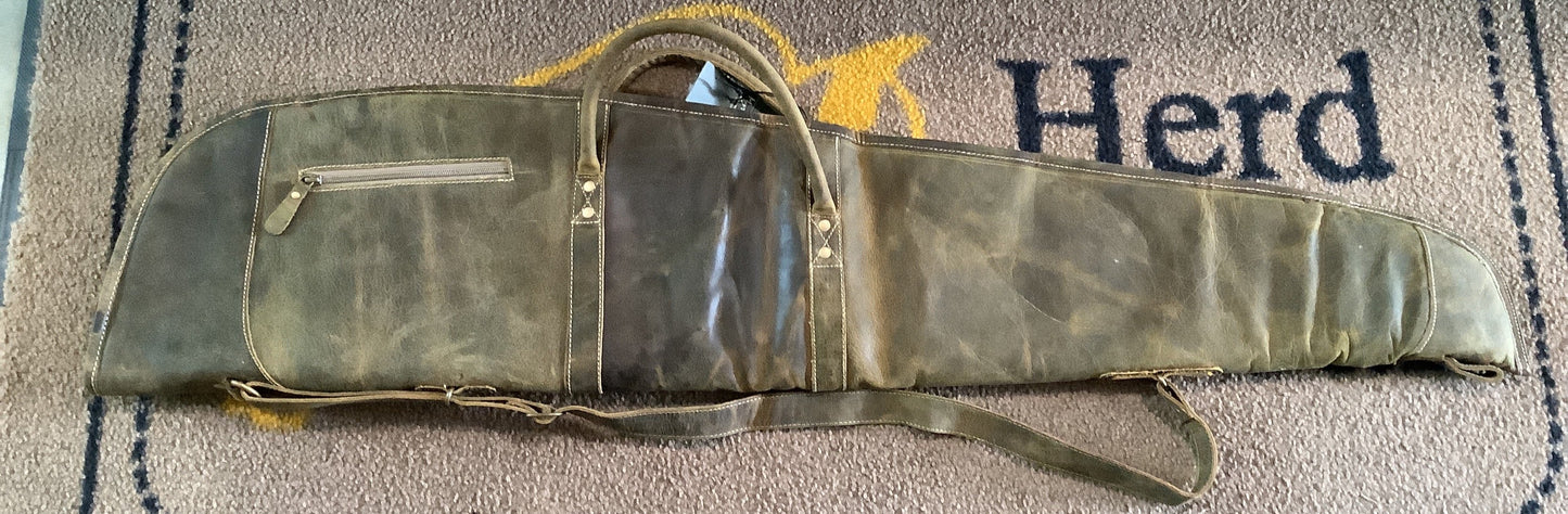 Distressed steer leather - very nice rifle case. Bring out the beast in you with this rugged leather gun cover. A shoulder belt, two small handles and a zipper to store the valuables are the major highlights. Shoulder belt and carry handles. Reasonable padding but not too much. Imported. 47" long; 10.5 tall. Heck of a price!