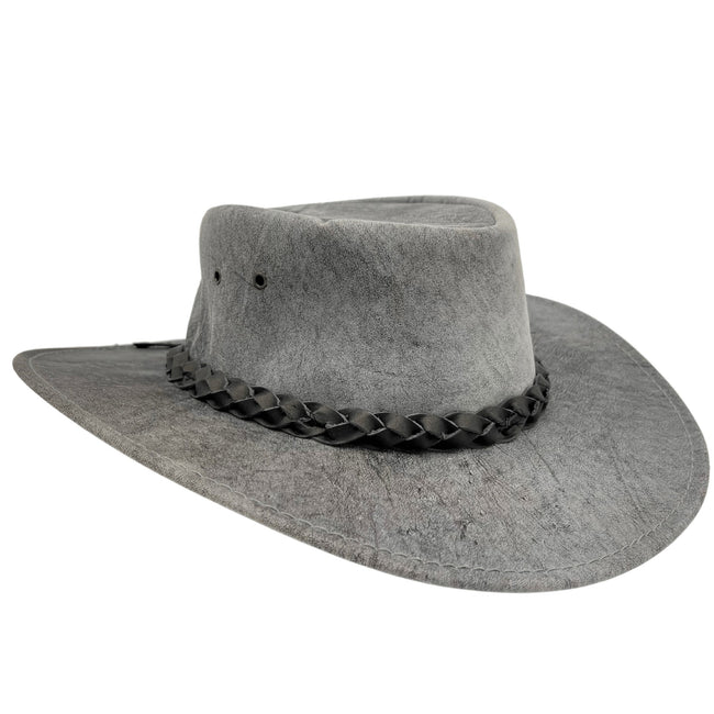 Handmade from 100% kangaroo leather and tanned with the distinct stonewash effect. It has a 50+UPF rating so there's no need to fear the heat from the Aussie sun. It's got an elasticated headband so it's as comfortable as they come!