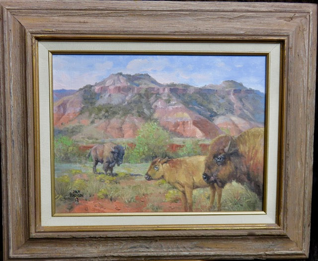 Two of Jack's favorite things - the Palo Duro Canyon of West Texas, a canyon in which Jack grew up ... riding, working cattle, exploring and deeply admiring ... and the bison that were native to the canyon back in the day. Beautiful, stark coloration of both. With the serenity that Jack captures from the days when it was only the wind and the sun to feed his imagination. Image is 16” x 12"; Framed it is 24" x 20" (all of Jacks works are hand framed at Against the Wall in Amarillo; Billy Dunavan ...an artist in his own right!)