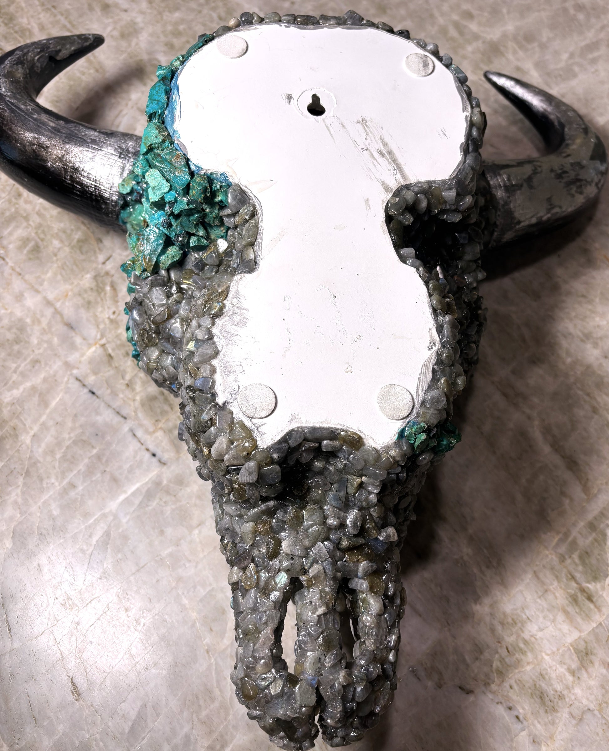 This piece is quite heavy - 14 plus pounds ... but the stone is real, and thus the weight. They hang easily and well with molded in hanger, so that is not an issue. They also display well just down on a table, as you can see. 18" tall; 17" across the horns; 13" from top of skull to jaw bottom.