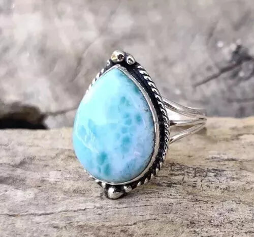 Two styles with authentic milky blue white Larimar stone set in .925 Sterling Silver tri braced single bands