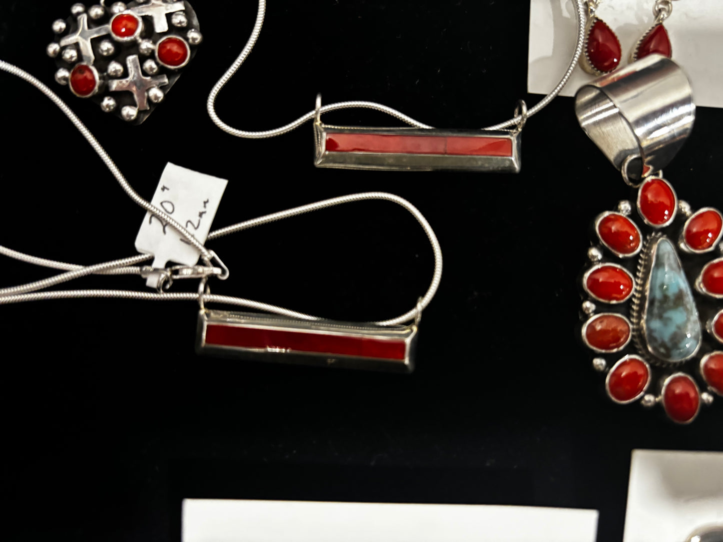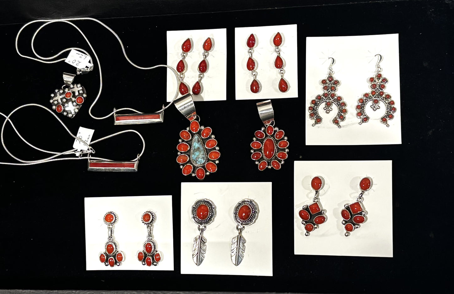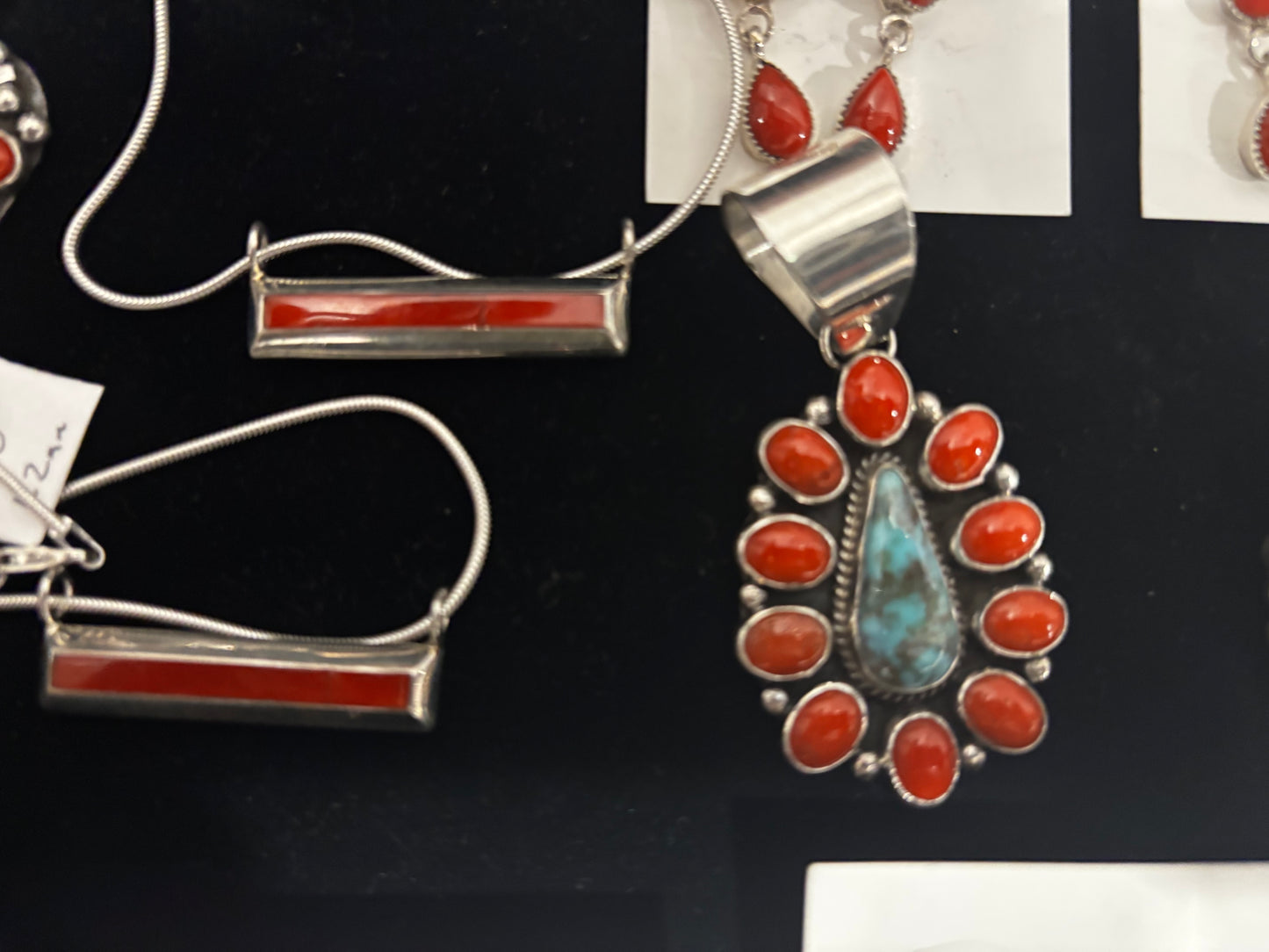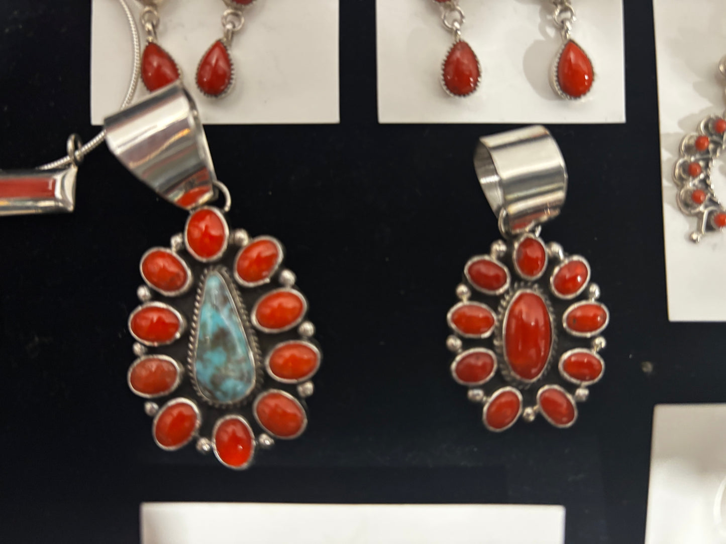Burnished Red Coral set in sterling. Relatively modest earrings ... a few a bit flashier. Just a couple of pendants to match (and yes, that coral and turquoise piece is even more stunning than the photo).
