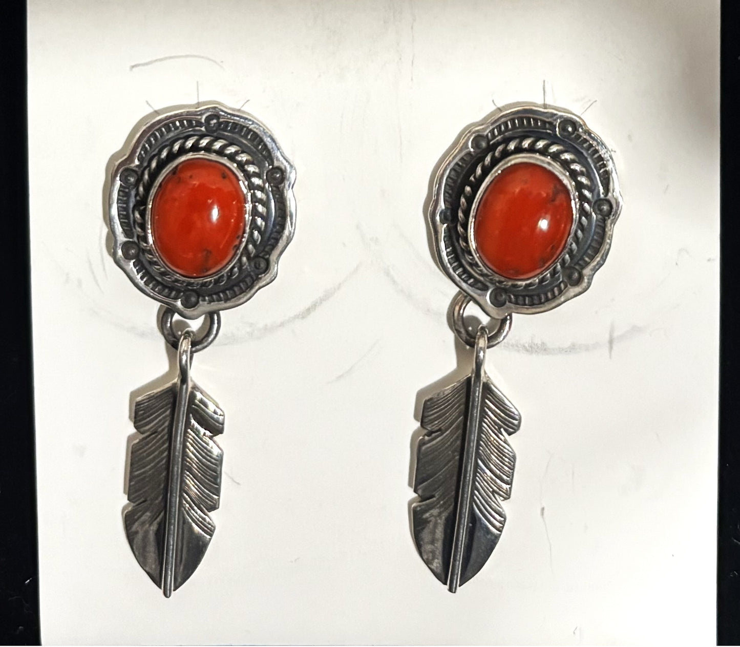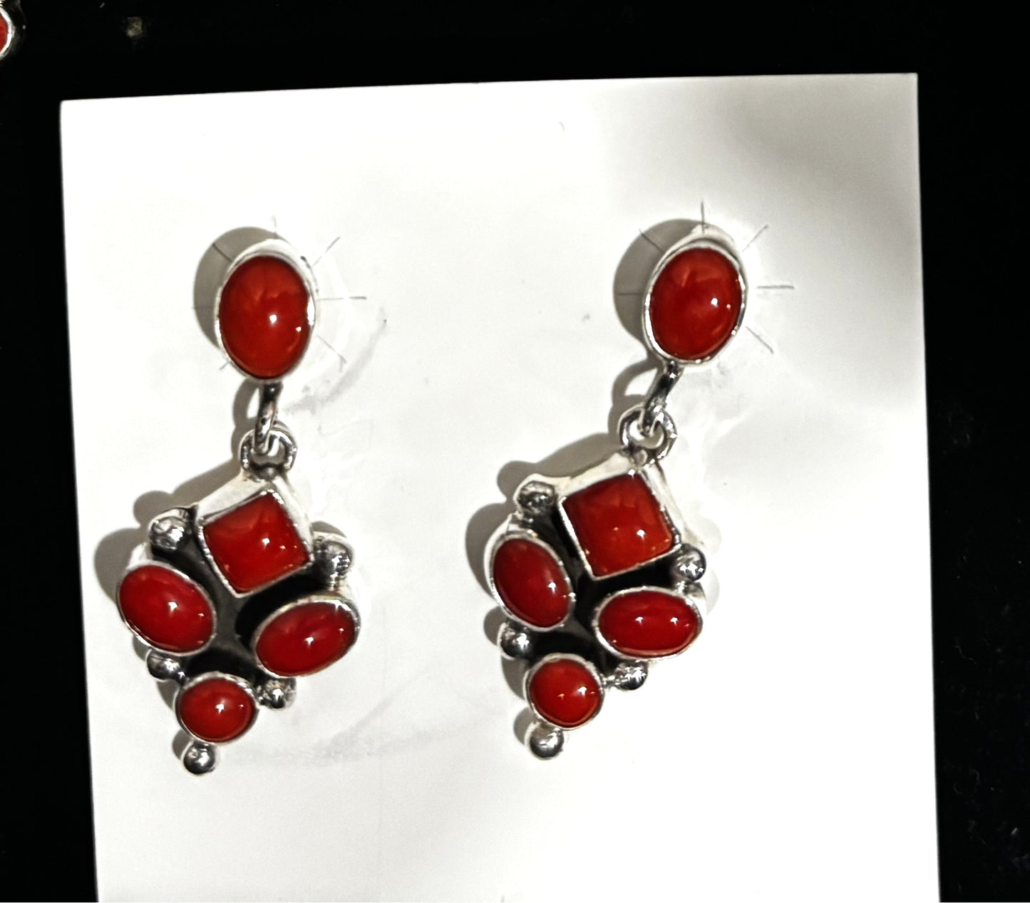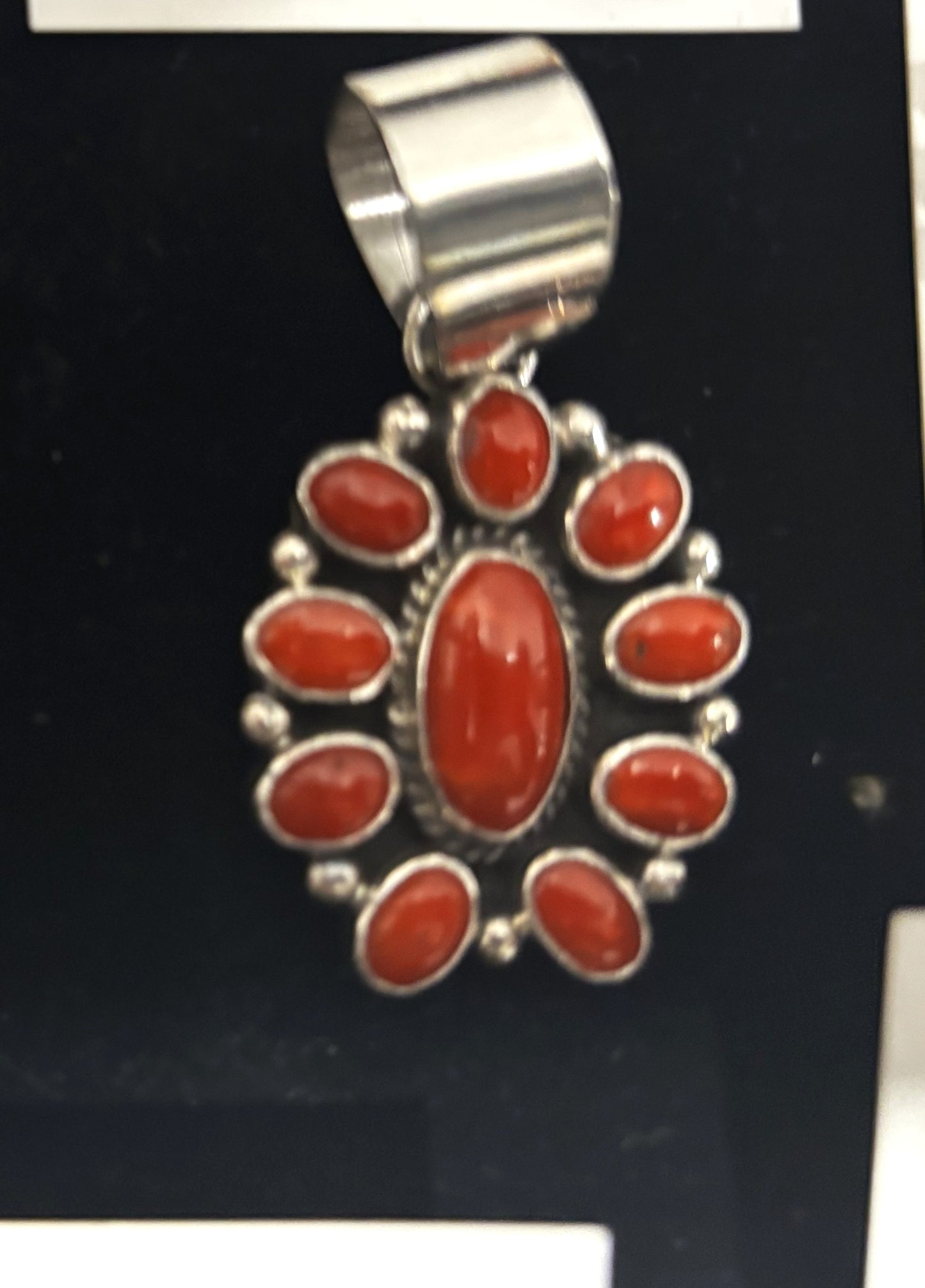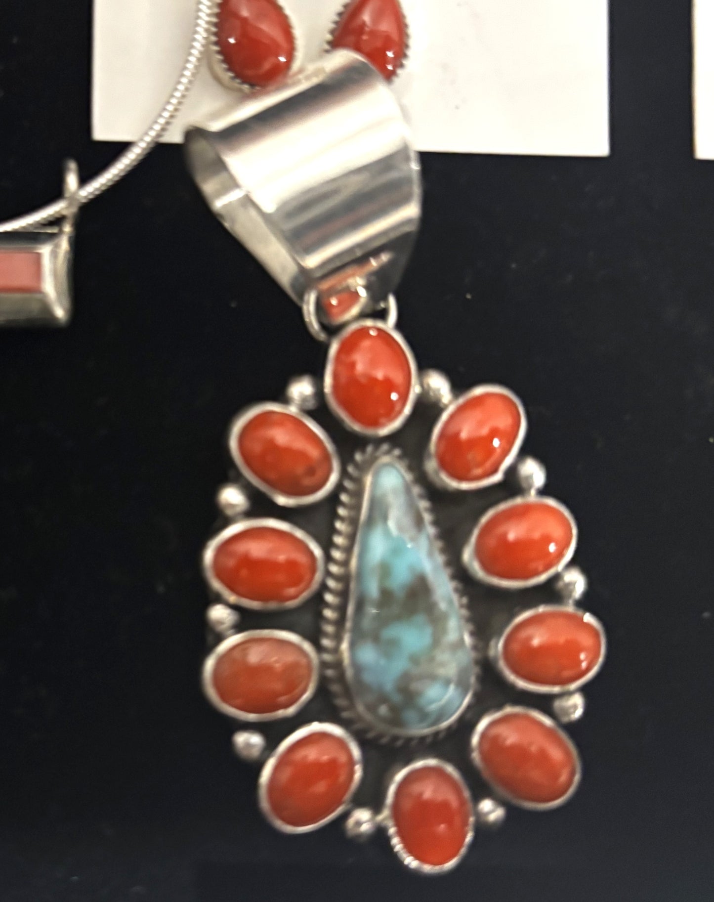 Burnished Red Coral set in sterling. Relatively modest earrings ... a few a bit flashier. Just a couple of pendants to match (and yes, that coral and turquoise piece is even more stunning than the photo).