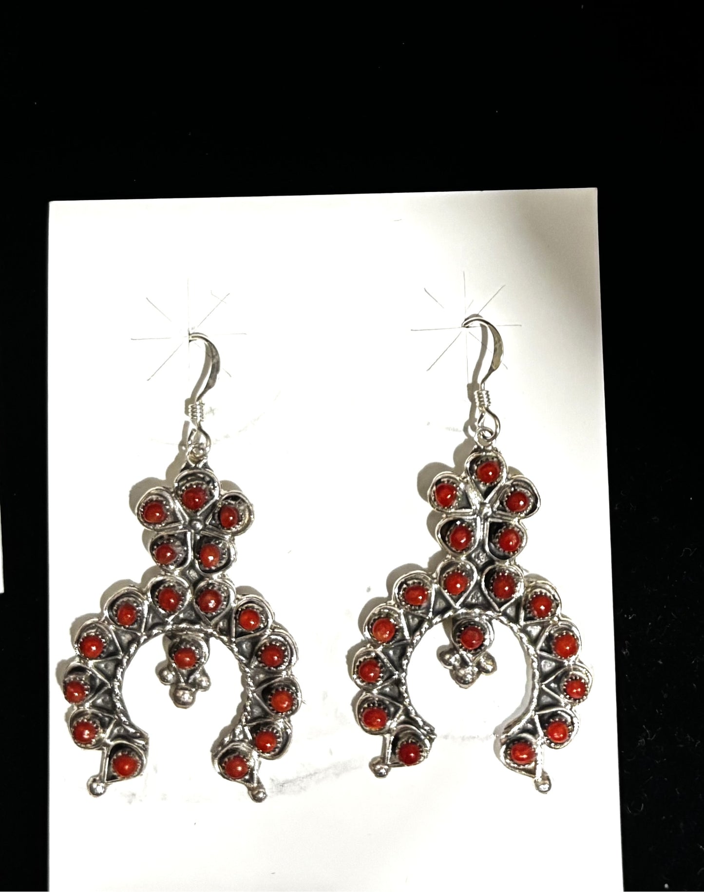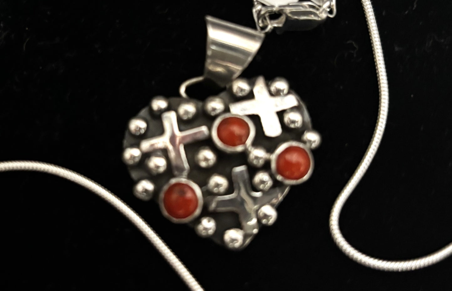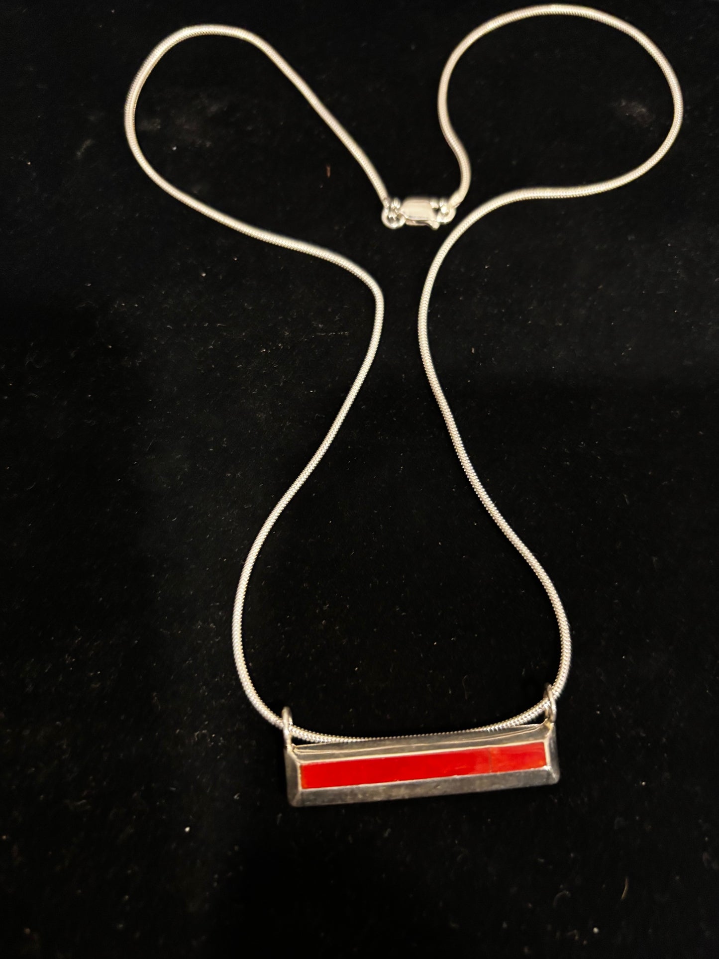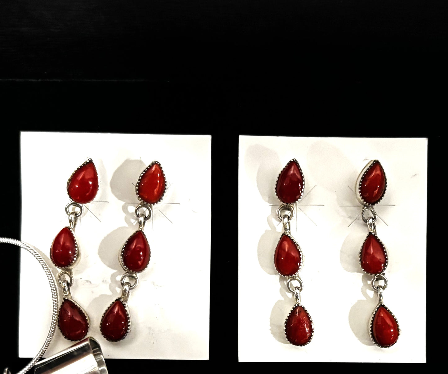 Burnished Red Coral set in sterling. Relatively modest earrings ... a few a bit flashier. Just a couple of pendants to match (and yes, that coral and turquoise piece is even more stunning than the photo).
