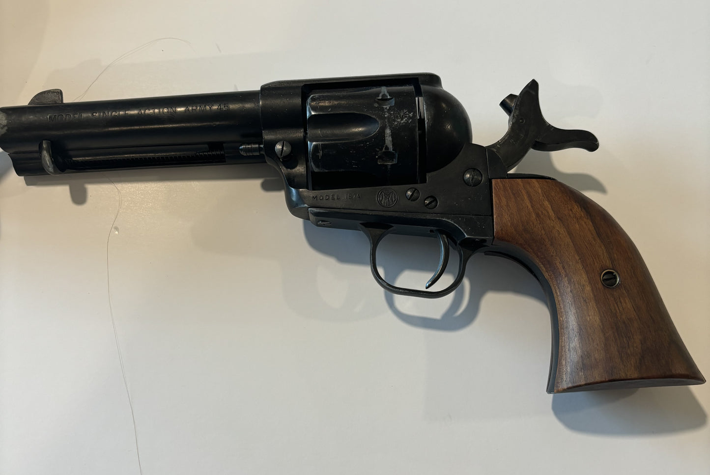 This is a movie prop pistol. Single Action Army .45 .... Model 1874. One of the pistols that won the West. Accurate in virtually all details.