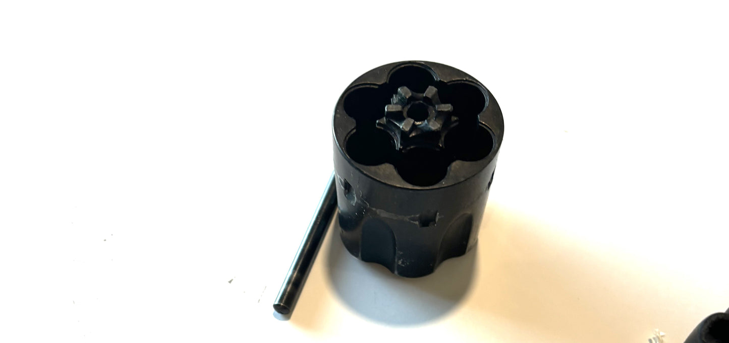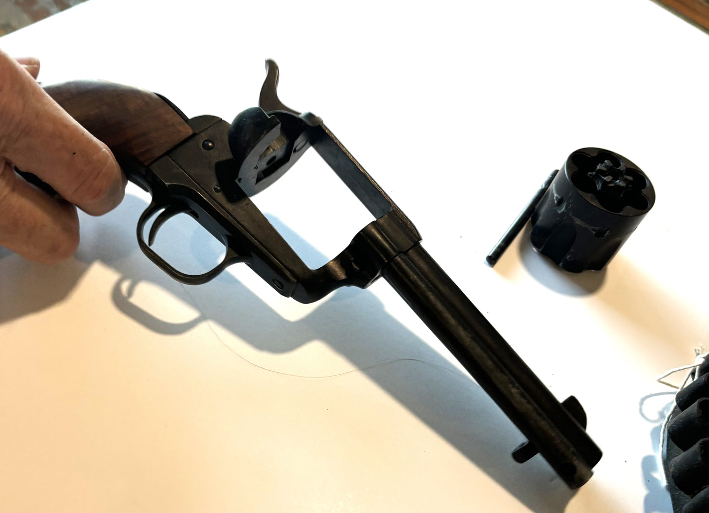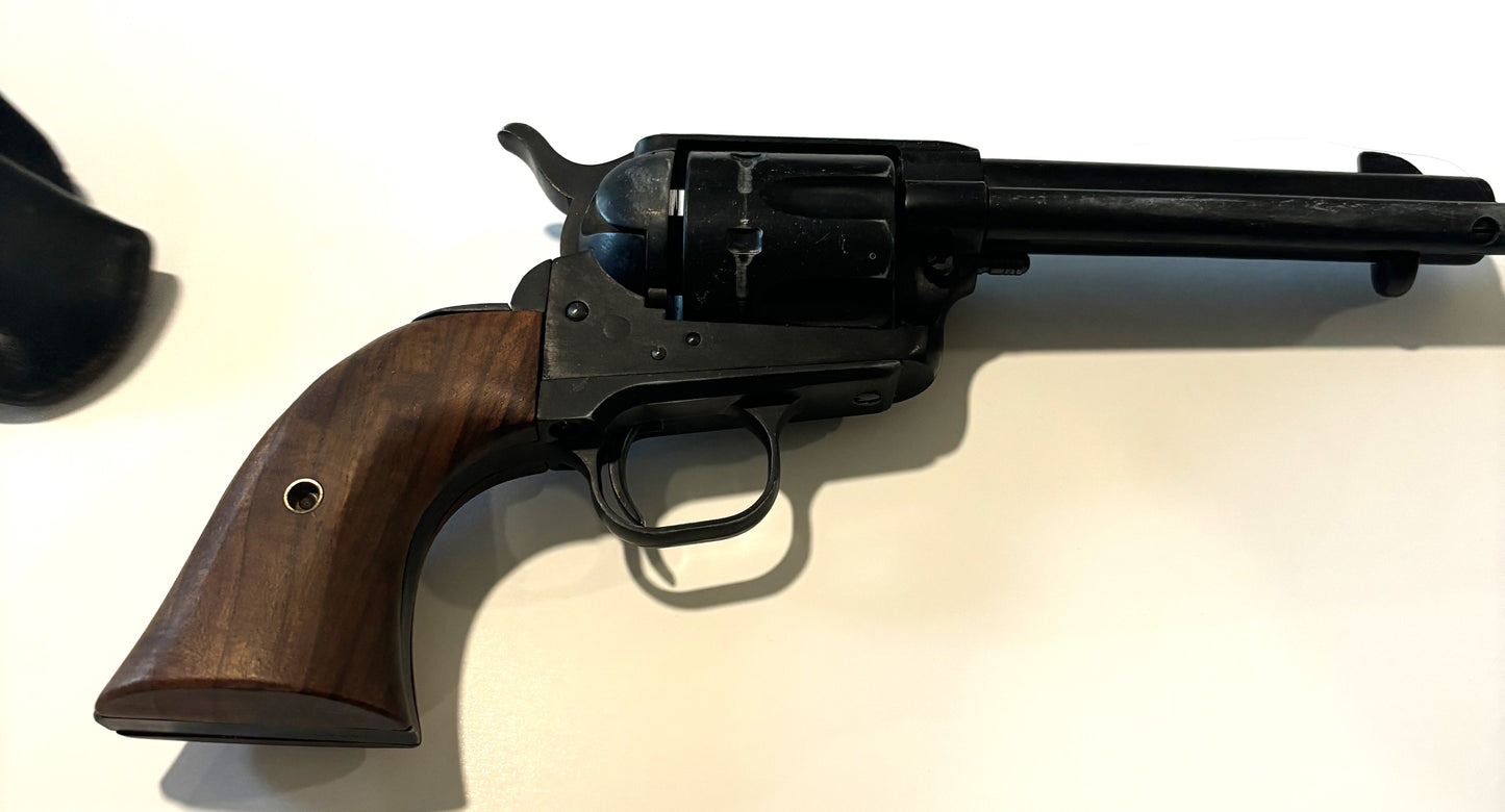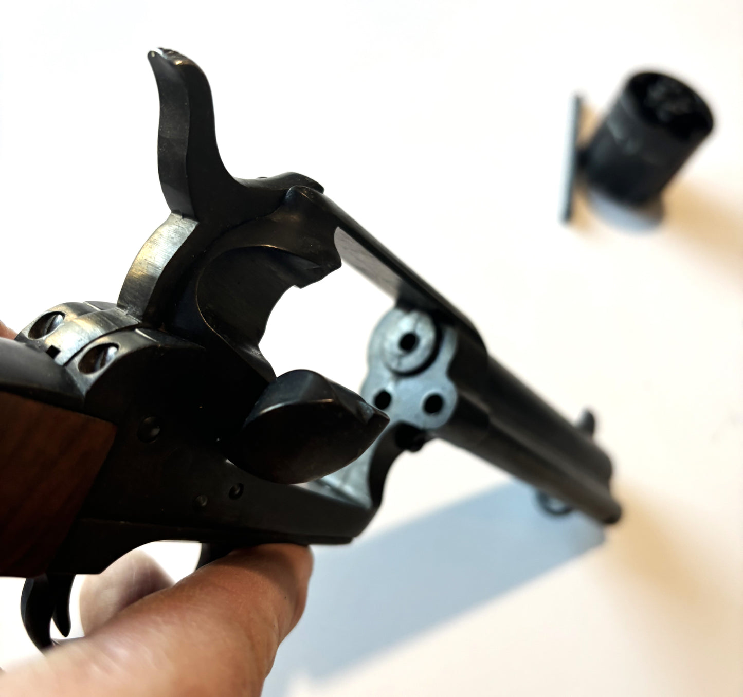 We've had several over the years, but I have no provenance on this one. It is metal, realistic in weight. The cylinder revolves; the hammer locks back and falls forward with the trigger pull; the cylinder is removable ... but there is no firing pin ; no bore ... it cannot and does not fire bullets. It is made to simply look the part. And made well!