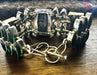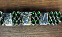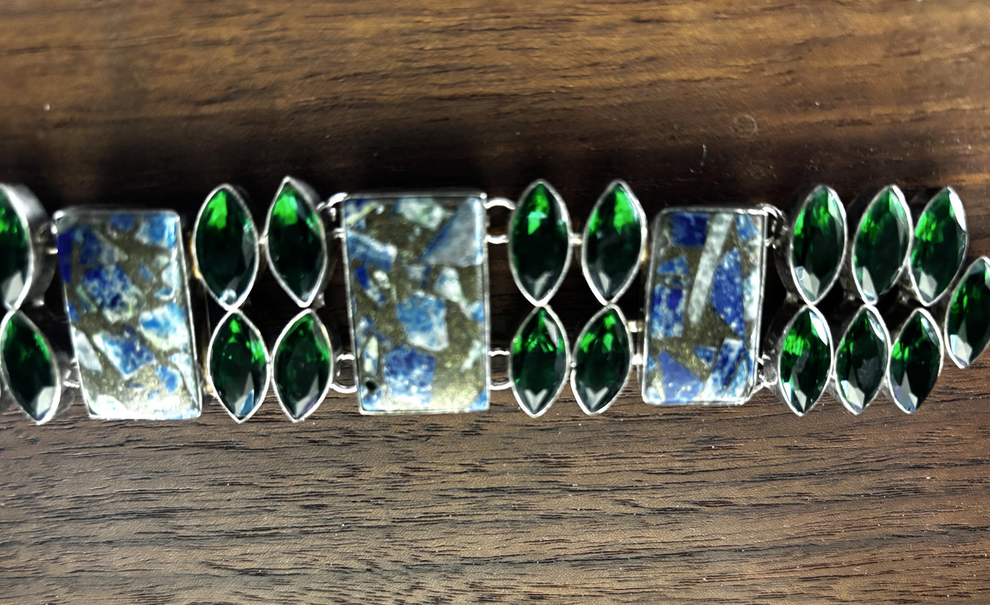 Just a slight bit showy, with 3 rectangular Lapis composite main stones. Accented by marquise green quartz set in sterling silver. Loop and bar closure. Weighs 56 grams (2 oz). Appx 5 3/4 inches diameter, with 2 inches expansion chain.