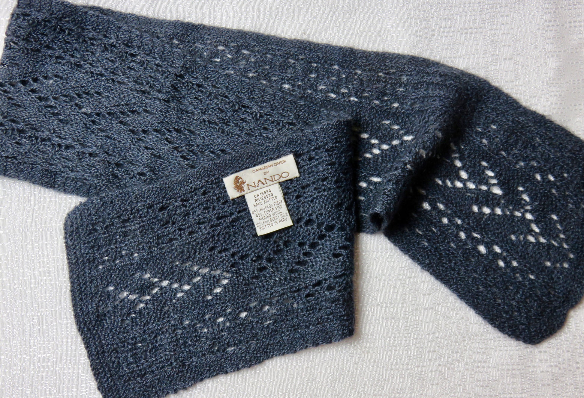 Nando 45% muskox / 45% super fine merino wool / 10% mulberry silk hand knit scarf. Beautiful midnight blue 40" x 5.5" made in Peru. Hand wash or dry clean.