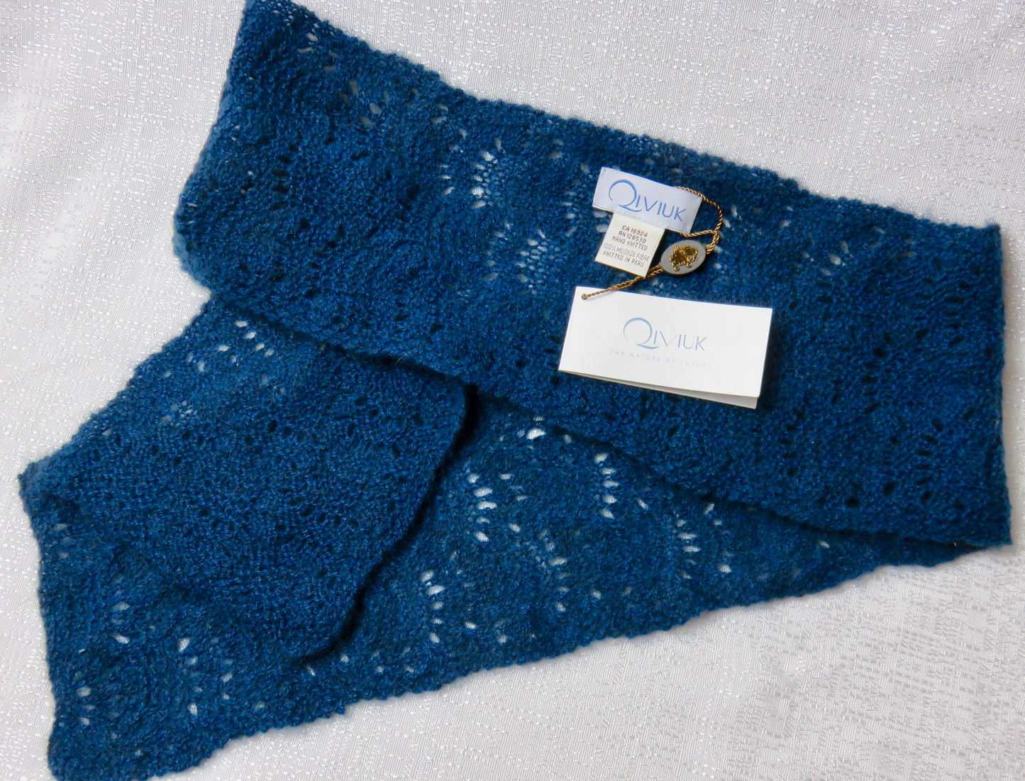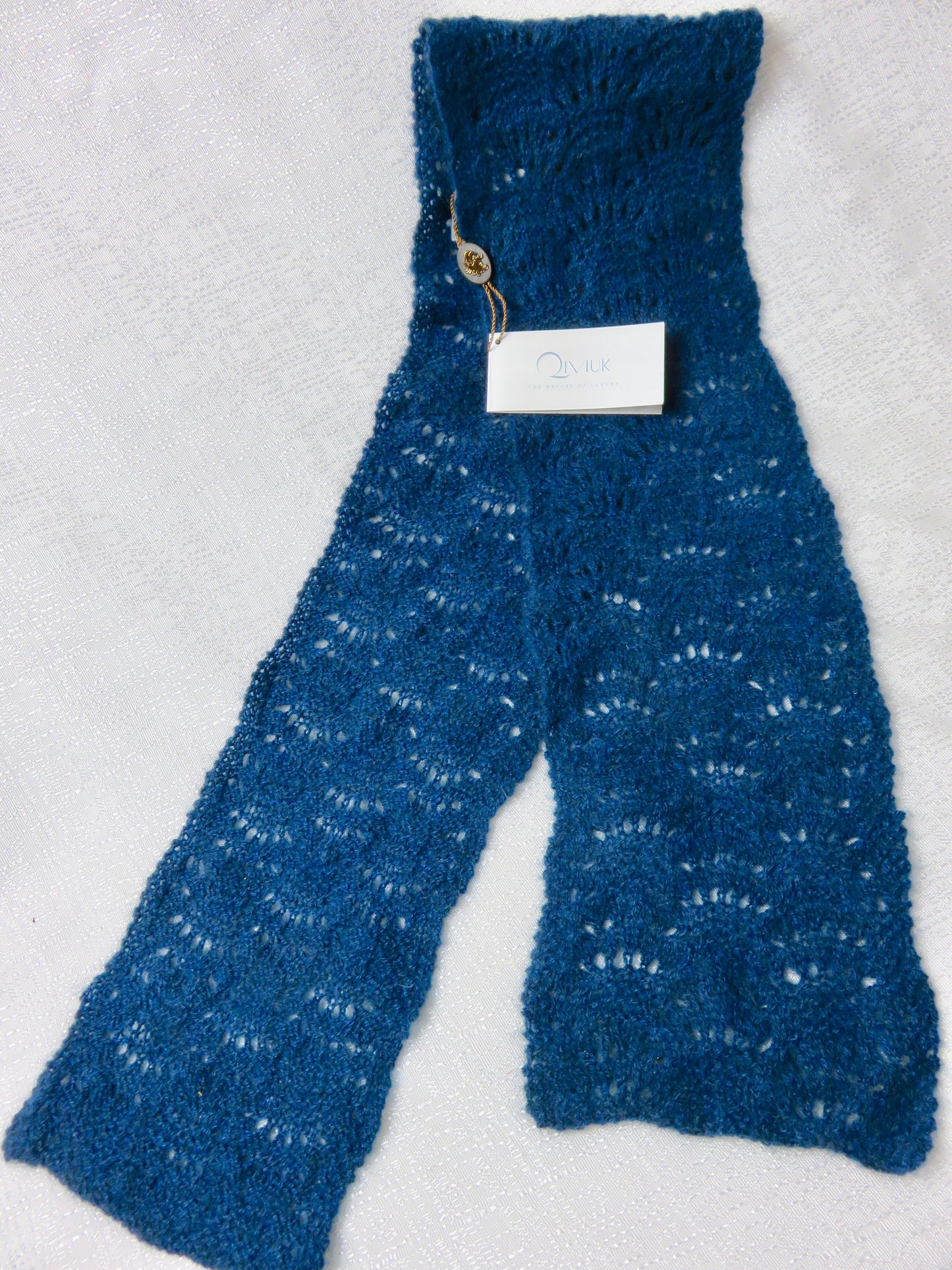 Qiviuk exquisite 100% muskox deep teal hand knit lace scarf will keep you cozy and warm. Made in Peru. 6" x 46". Hand wash or dry clean. 6" x 45"
