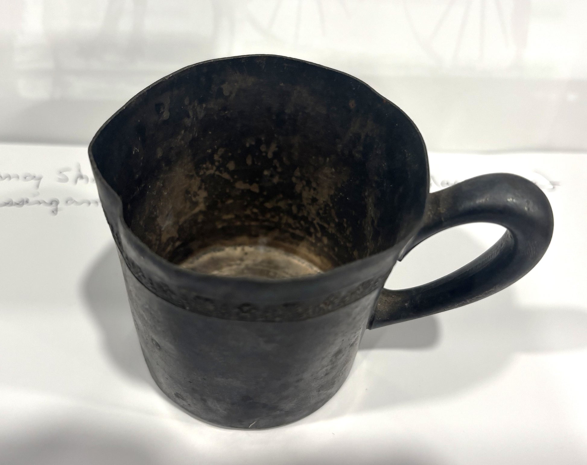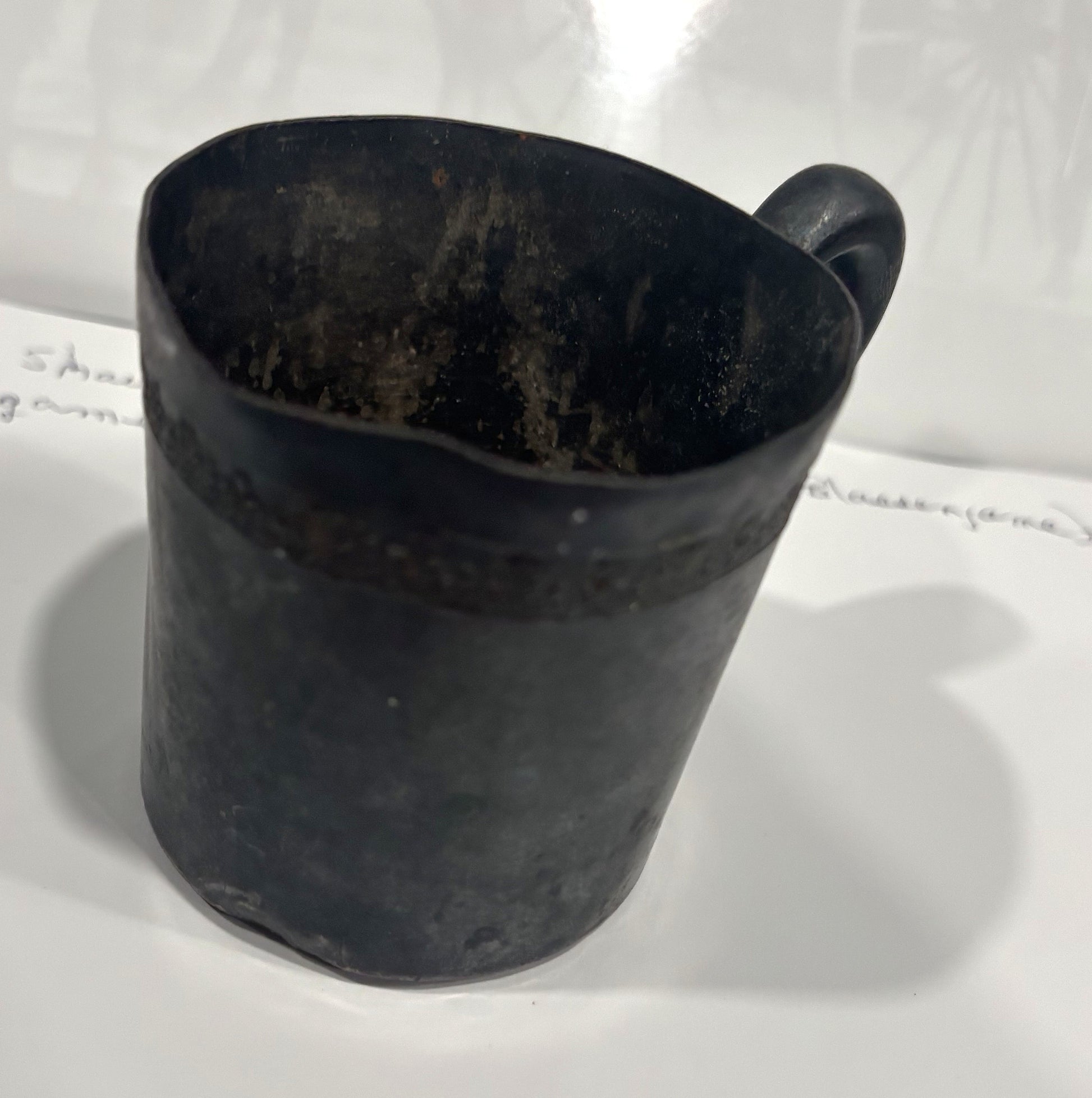 Just a  neat old heavily patinaed tin cup or small pitcher  - not enameled or coated (so I wouldn't use it for anything related to drinking).