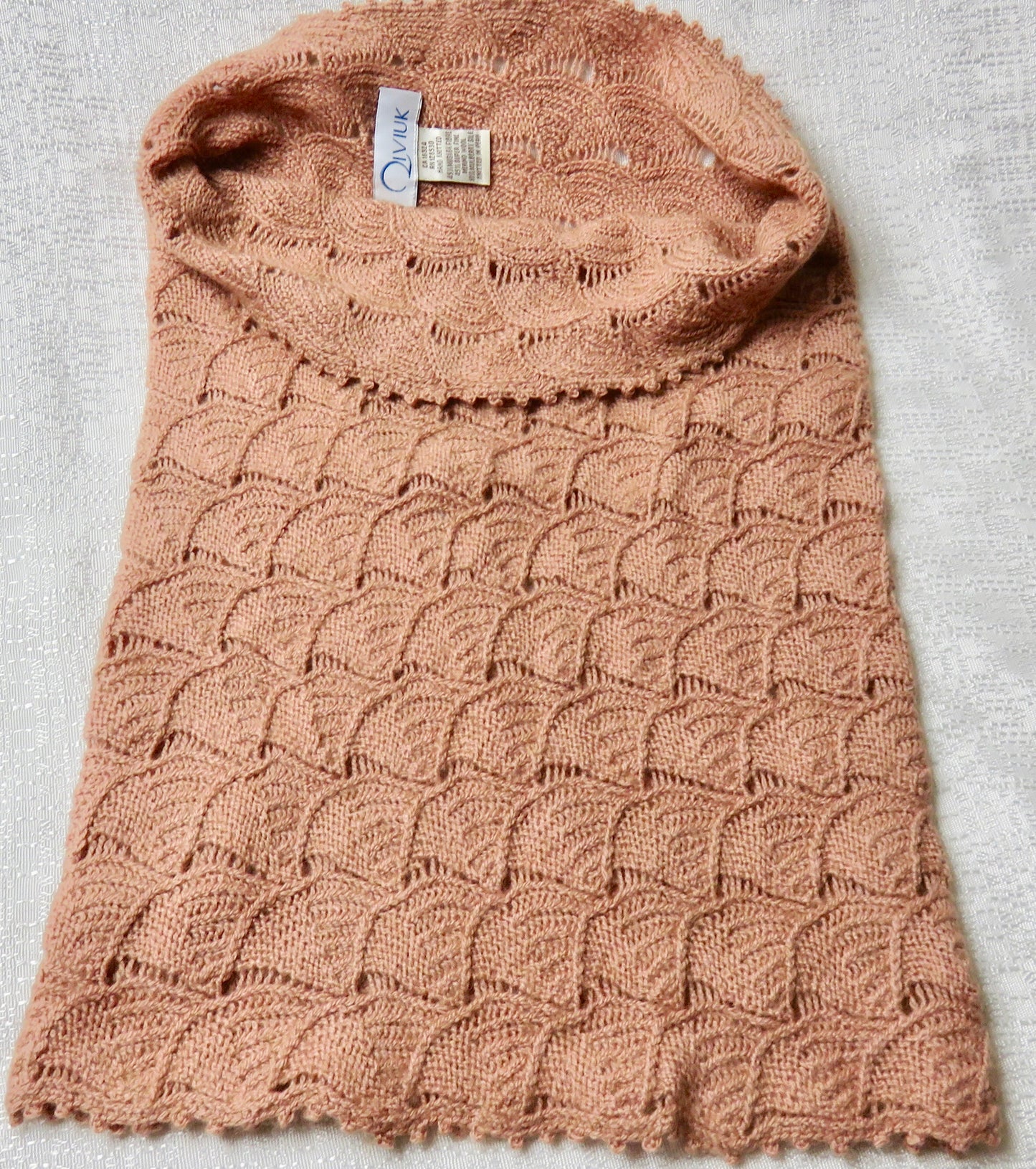 Qiviuk rose smoke ring cowl 45% muskox/ 45% super fine merino wool/ 10% mulberry silk hand knit in Peru. 12" x 19".