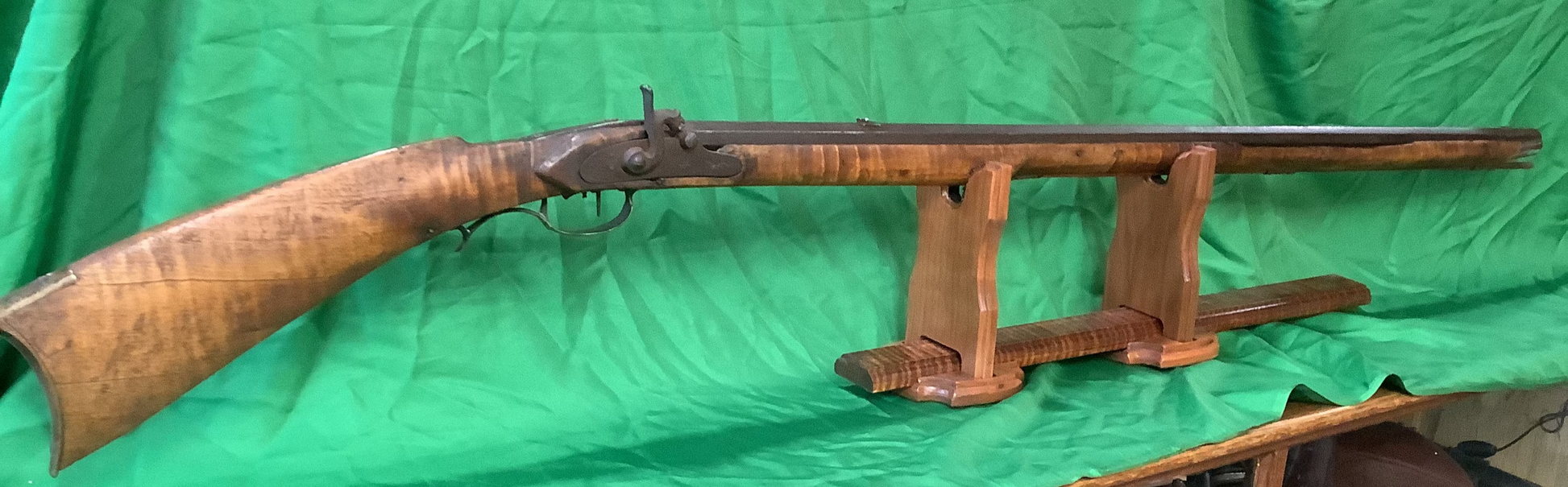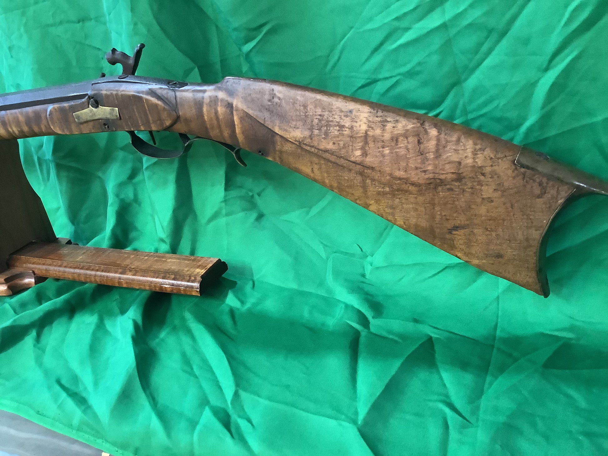 Tiger maple; full stock, not much in the way of sights, hand made ramrod, brass barrel support. Marked S. Stout." Dan knows the guns still around that Stout made. This is one of them. And .... there is a ball stuck way down the barrel that cannot be moved out of the way. The gun is inoperative.