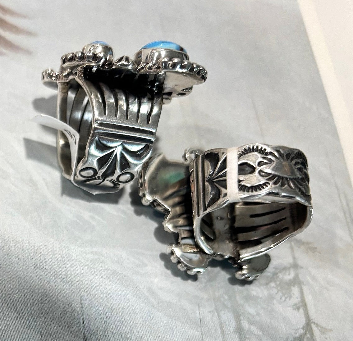 The silver beading seems to make these dainty little creatures flutter as your hands move.  Exceptional pieces from a multigenerational family of true Native silversmiths.  Geneva learned her talent from her mother., Genevieve, who in turn learned it from her parents and uncles.  These artists know both silver and turquoise.