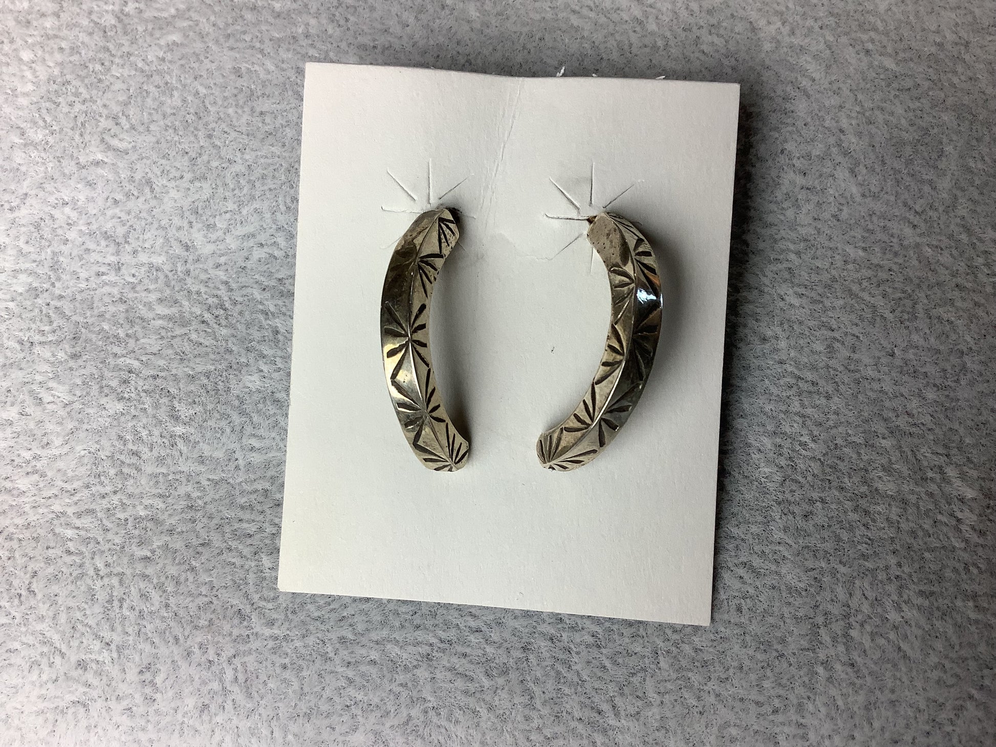 One Third circle post earrings, with a traditional Native three point marking. These are reminiscent of hand stamped silver of the 30's and 40's. Last one of these. just 7 grams total weight