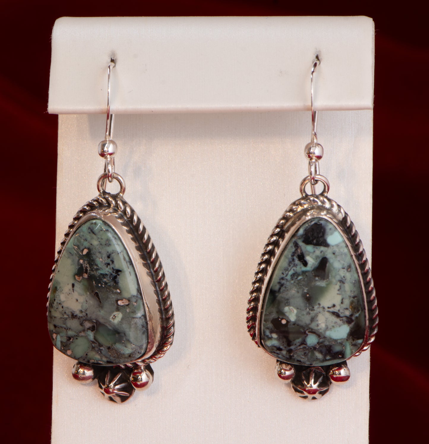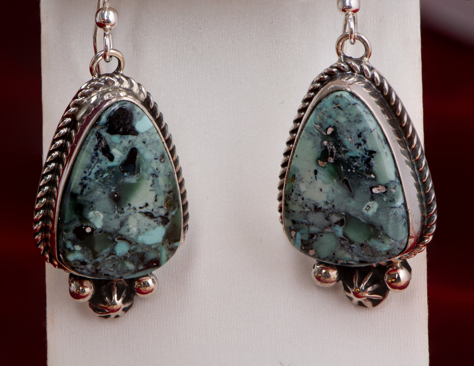 From the Silver Pearl Ranch collection. Native made variscite with all it's blur/green hues and brown matrix. Add to that three sterling silver balls that accent perfectly your neck string of Navajo Pearls. What, you don't have any Navajo Pearls to go with your new earrings? Well, we can take care of that, can't we.