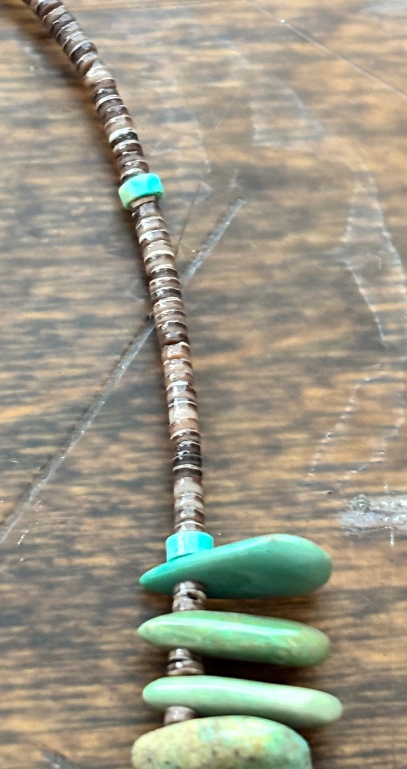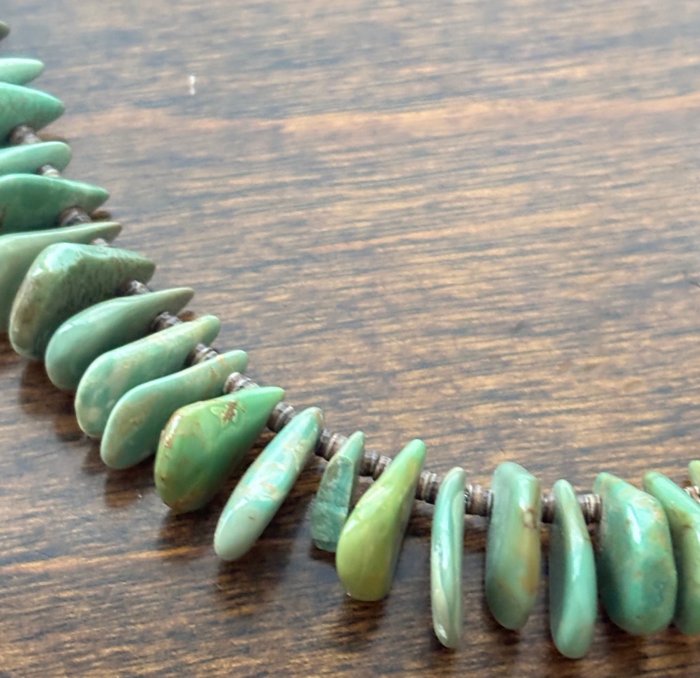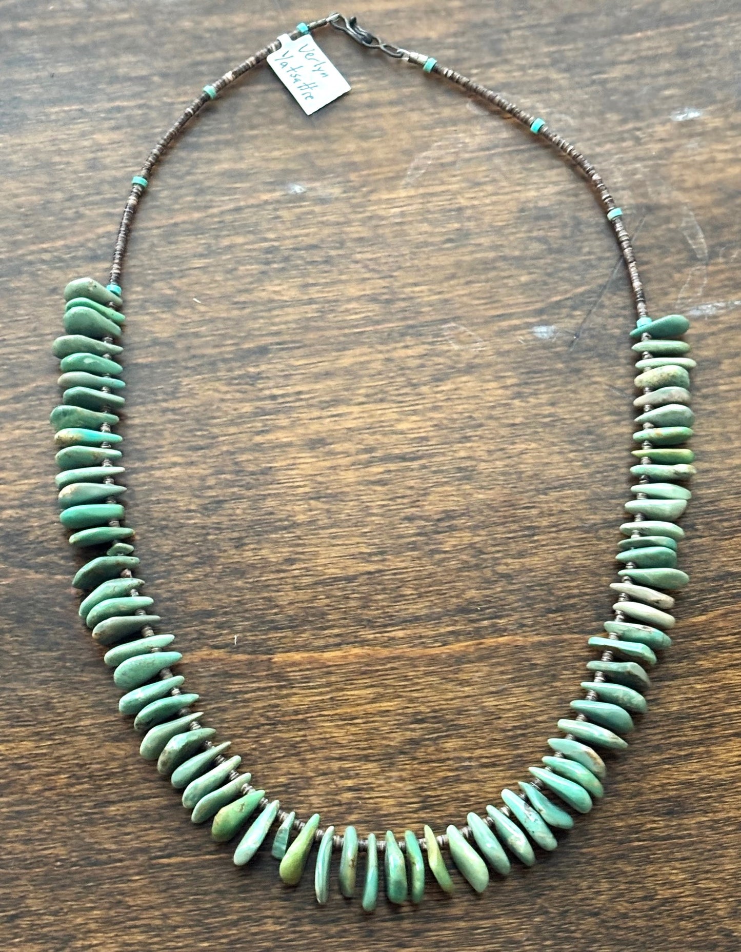 Hand crafted by Verlyn Vatsattre, zuni artist and crafter, of individually rounded turquoise triangles in a darker shade; offset holes so they string with the narrow part inside. Designed to frame the face that way. The necklace is new, but two of the turquoise triangles have broken. Not obvious ... but they are there. Spaced with shell heishi and a couple of turquoise rondelles.