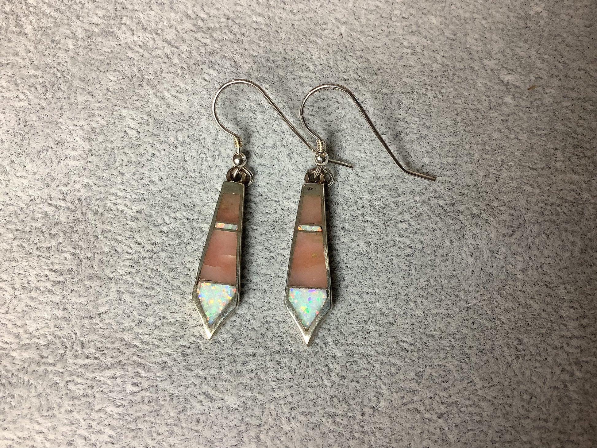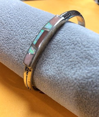 Native Made. Exceptional quality. The pink stone is the Peruvian Opal. The "opal" looking sparkly white is synthetic opal ... man made opal. It's what most "opal's" today actually are. This bracelet is made to pair perfectly with the Peruvian Opal lariat necklace and/or any of the 3 different Peruvian Opal earring sets - the open heart, the huggees and the necktie earrings. There is also a Peruvian Opal heart pendant; all excellent quality Native made Sterling Silver inlay work.