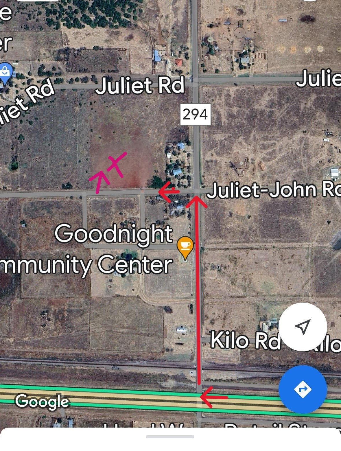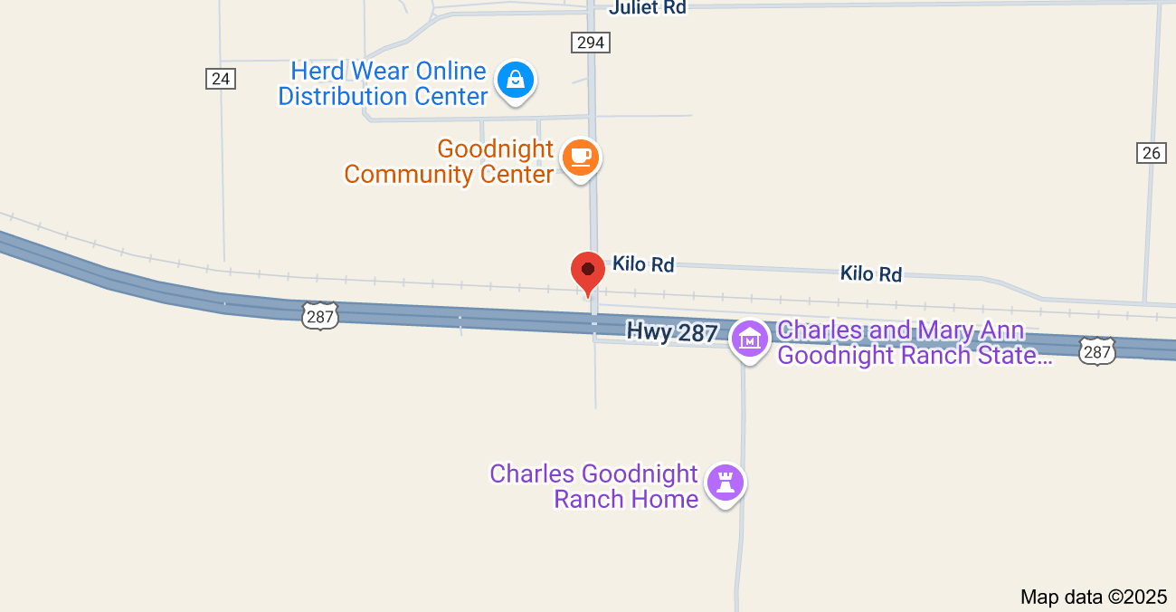 Here are the directions: From US 287, go North on FM 294. Cross the RR tracks and second street - Juliet John Road. Turn left (west) ... past the grove of trees and there we are. Turn at the blue dumpster and drive all the way back. It is the last "garage" door.