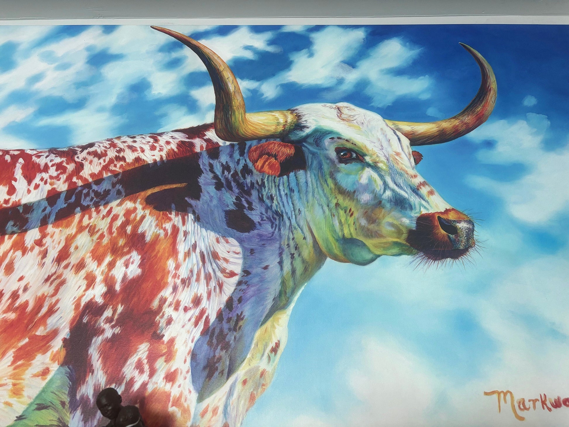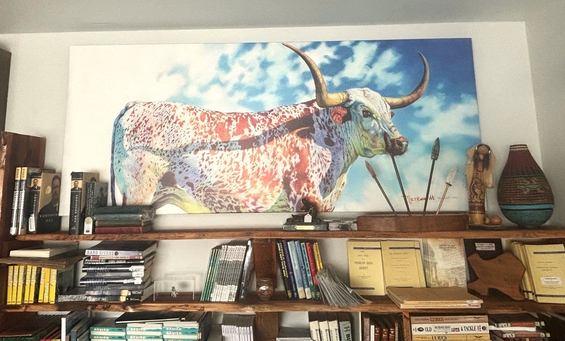 "This longhorn steer was a neighbor I could see from my studio (In Burleson, Texas ... only about 9 miles from my old place there - cm) , and he has long been a favorite subject. He'd trade a scratch behind his horns for posing in a photo session. I took a lot of license with the patterns in his hair in order to tell some tales of Texas. See what you find!"