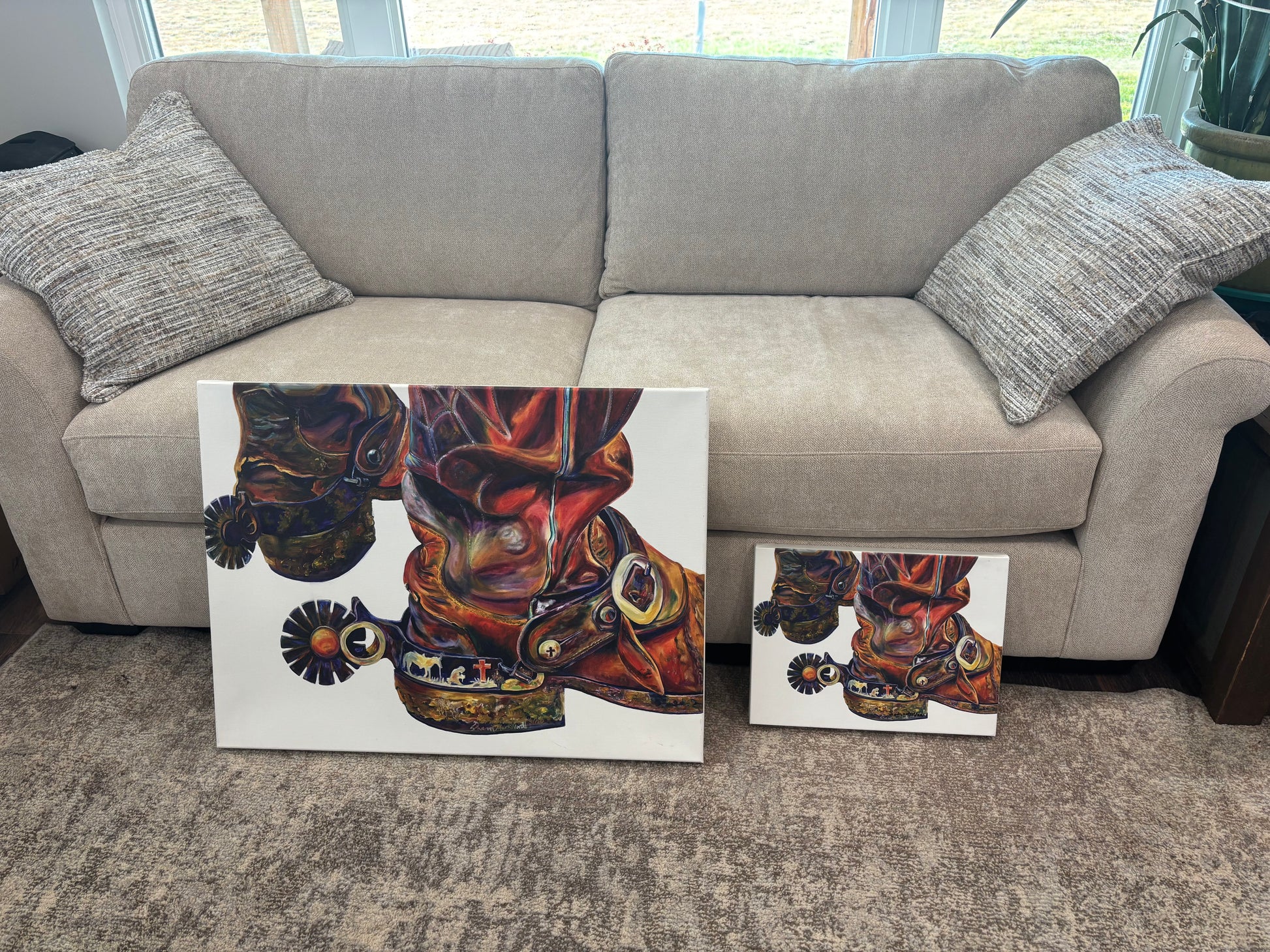 It depicts well-broken in ... or down ... custom boots with spurs, mud and detailed with a cowpoke (and her mount) at the cross. Both have been hand signed. The larger is from a limited-edition 24" x 32" edge-wrapped giclee... this one is #5 of 150. Shipping and insurance will be a flat rate $50 in the US.
