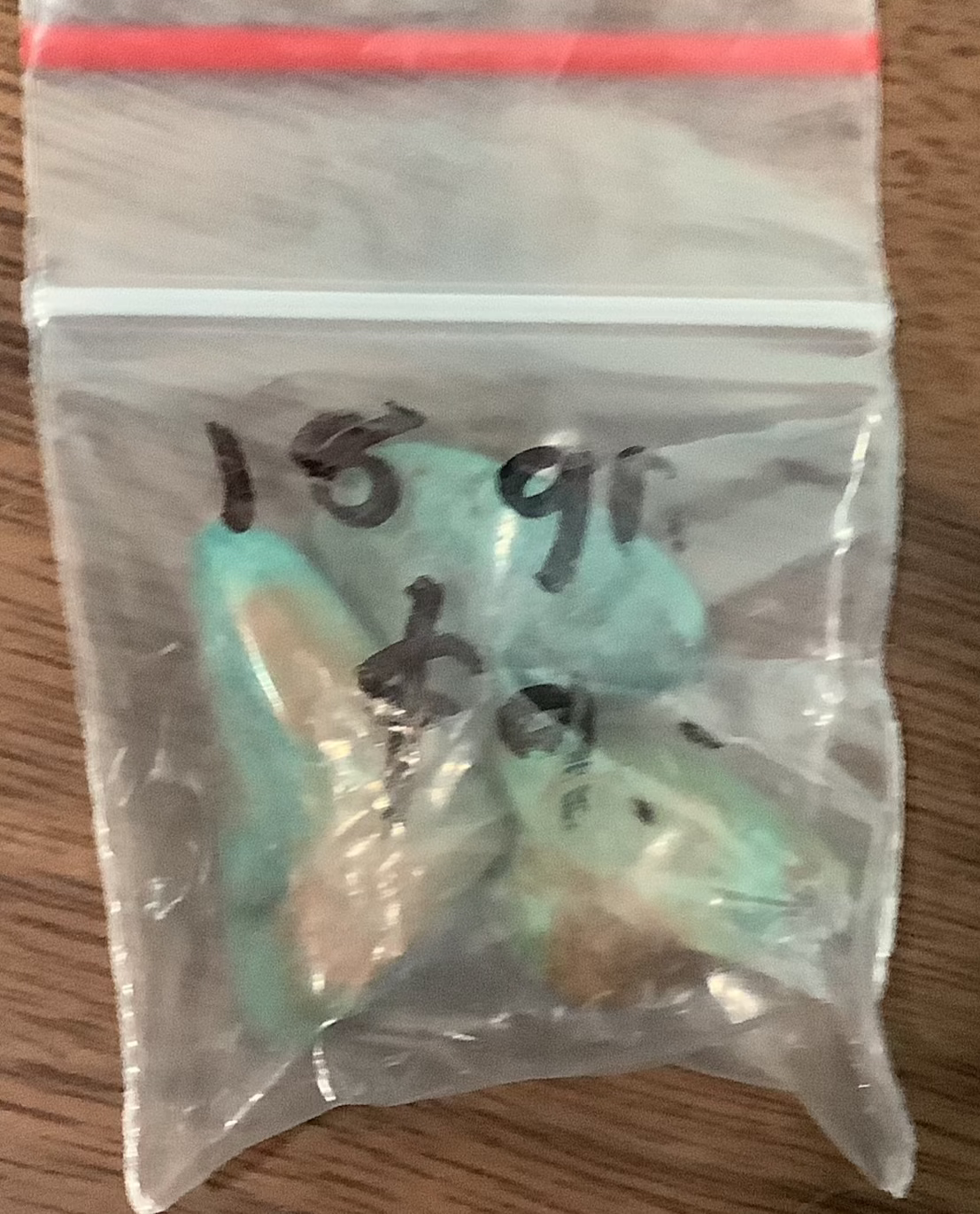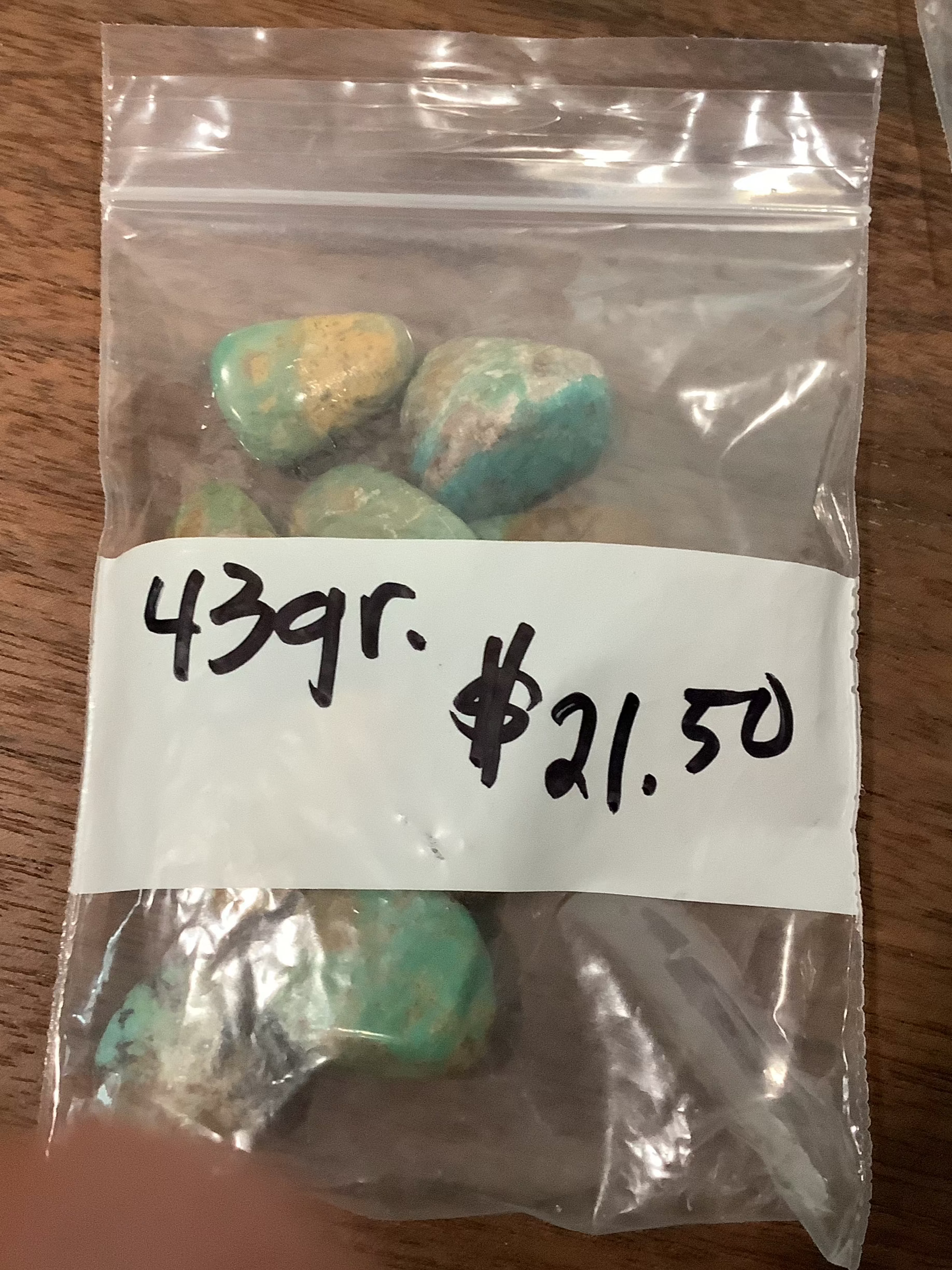 Bisbee Turquoise nuggets (and one piece of Kingman turquoise). Just a few sets left. Prices are when these were bought about 10 years ago.... so you know the rest of that story. Price is about 4 times what it was then based on what I just researched... but these just need a new home.