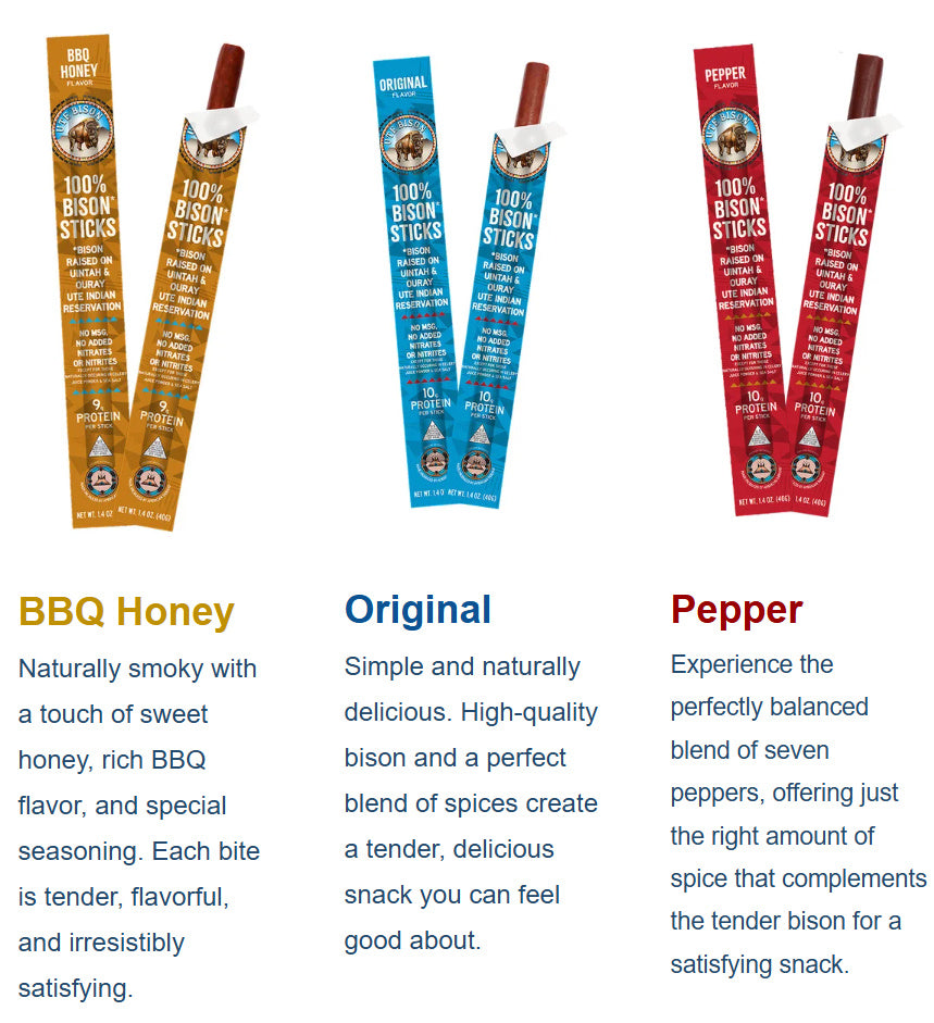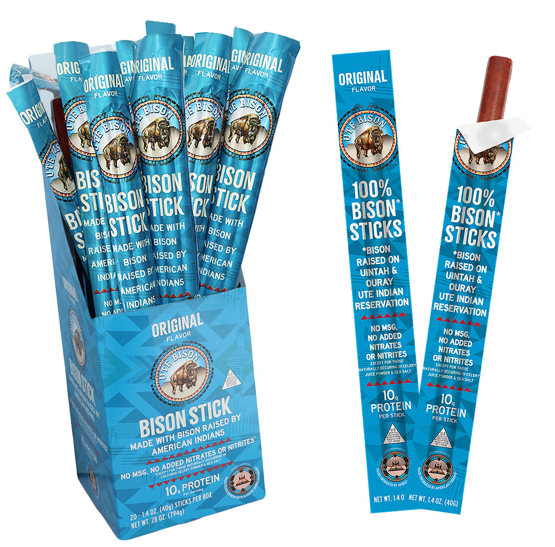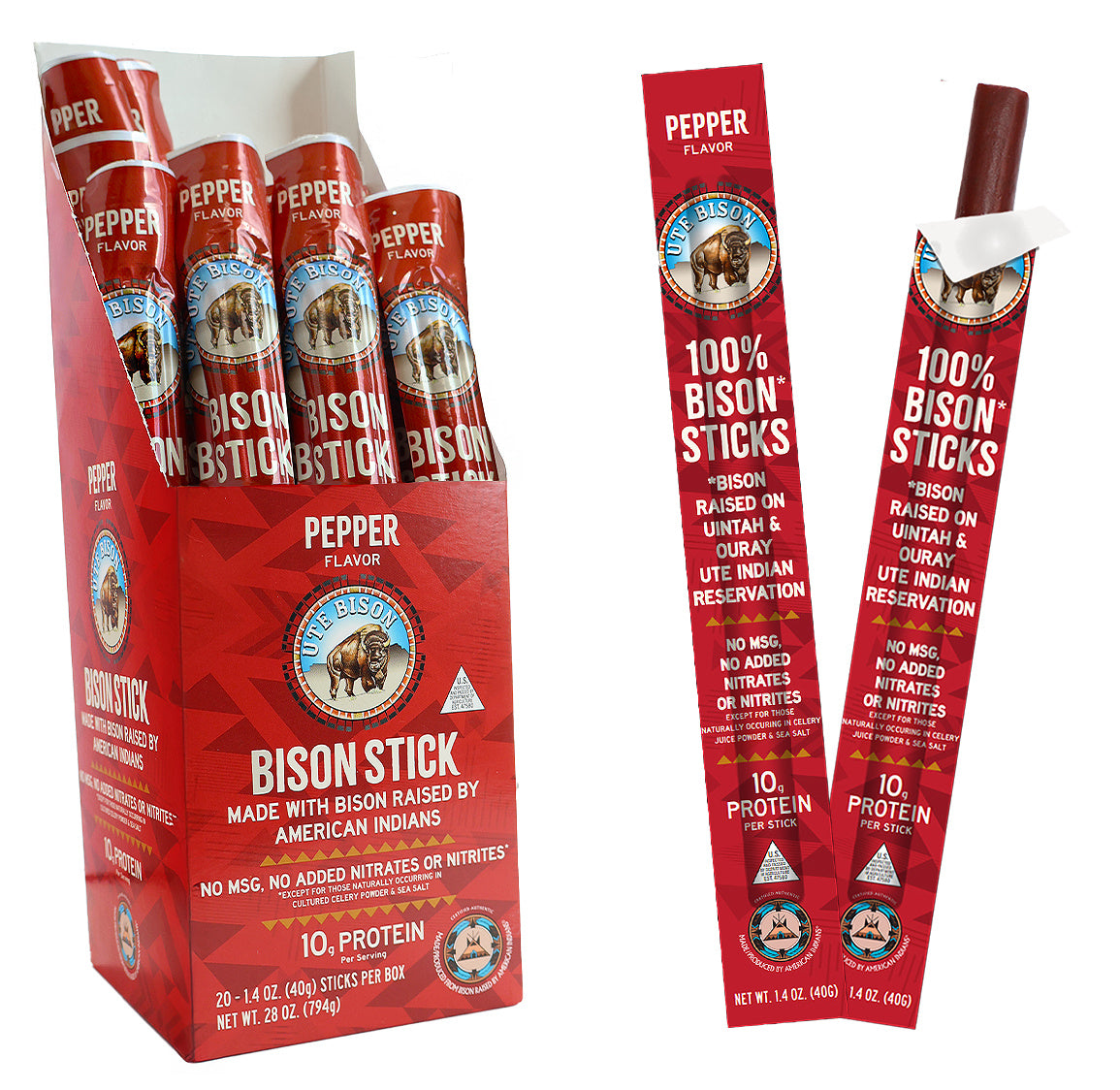 The NEW Ute Tribe bison meat sticks. A very nicely made pure bison 1.4 oz meat stick - not overly salty or greasy. Just bison meat and a bit of spice. Excellent protein snack. No refrigeration needed. Now in 3 flavors: