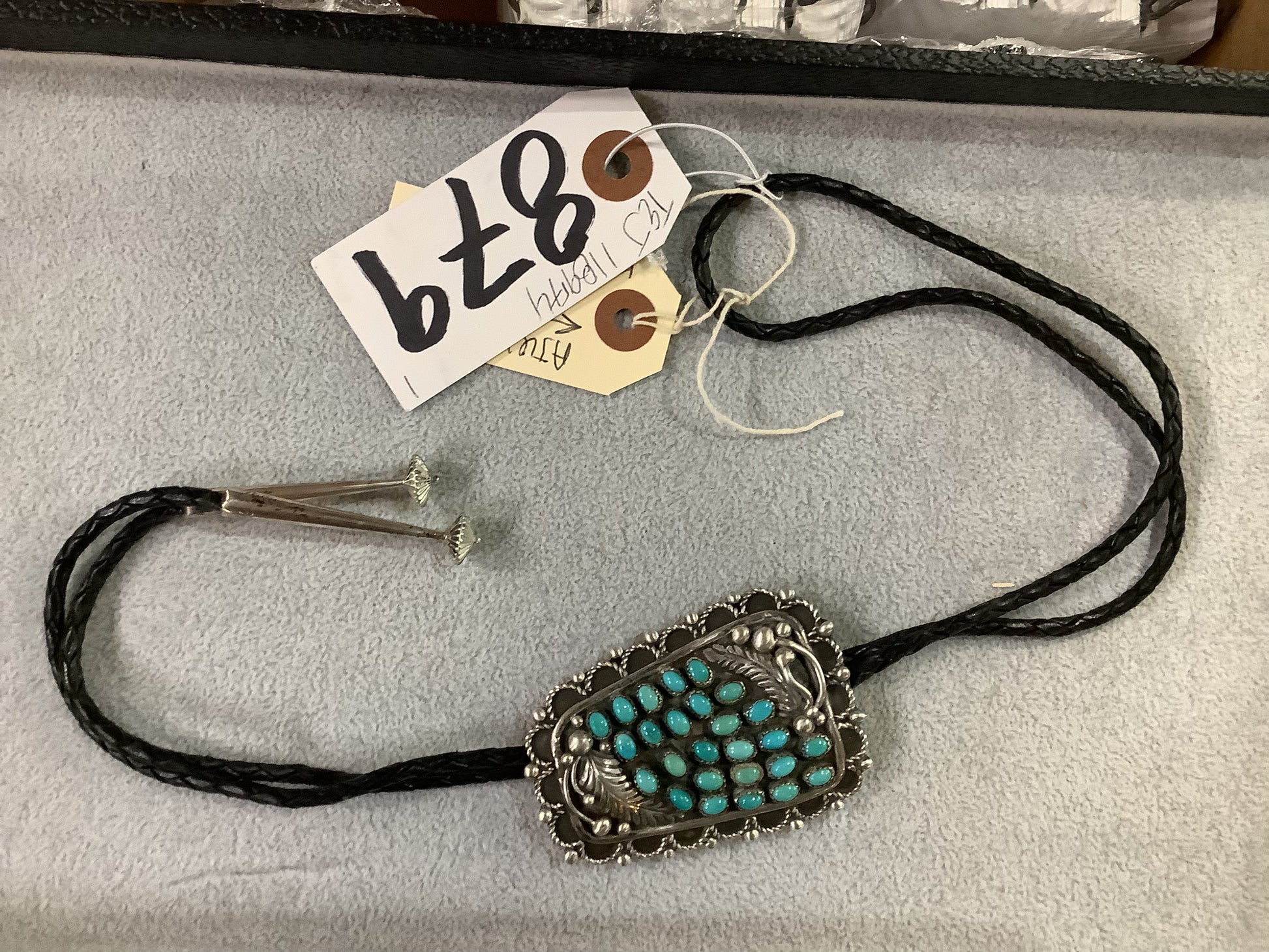 Vintage - Heavy Sterling Silver and Turquoise Needlepoint Bolo Tie