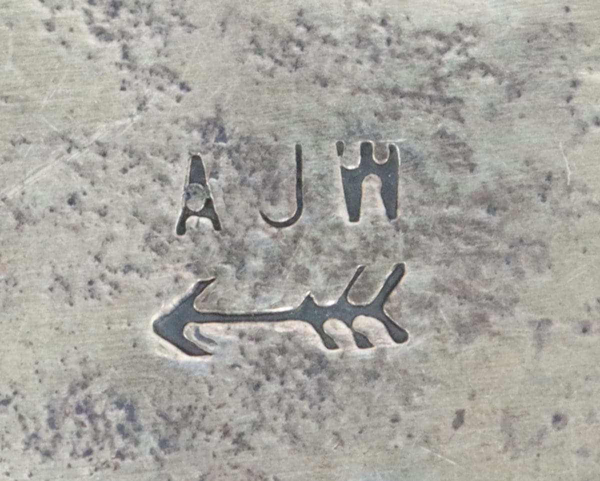 Hallmarked with Arthur J. Williams distinctive left facing arrow (meaning this piece was created after 1970), it weights in at 57 grams. All of the turquoise points are intact. A beautiful piece. Distinctive silver end points, as well. Nicely balanced. New leather neck strap was put on after we got it.